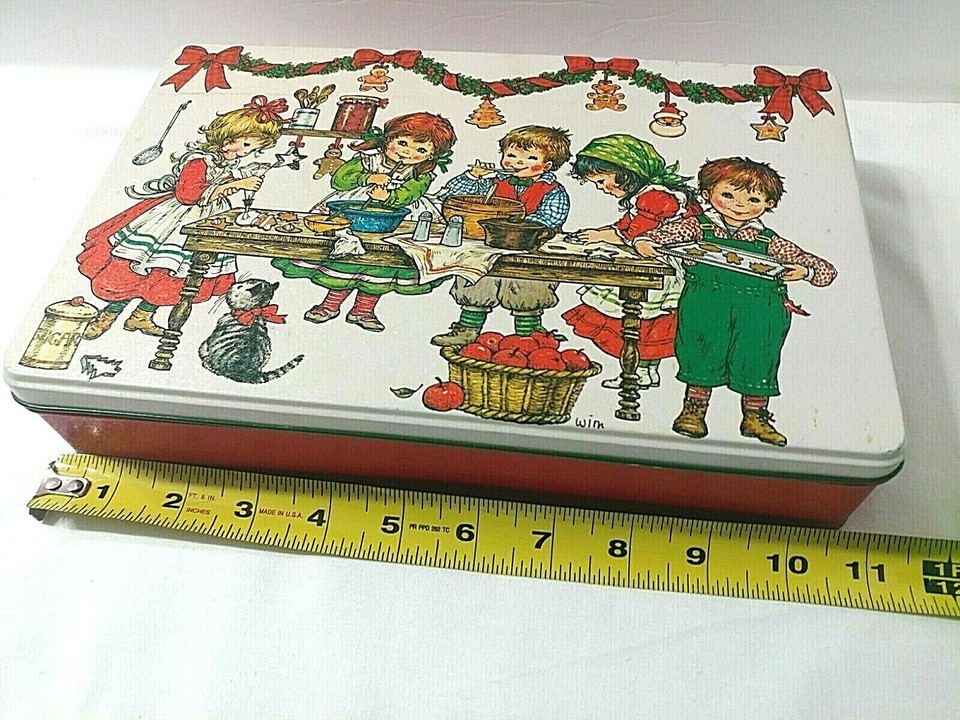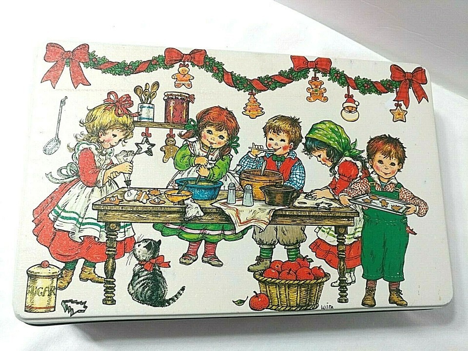 So very charming (and hard to find) -- a tin featuring children baking Christmas cookies -- with cookie cutters and recipes inside!