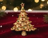 ?Style/Features: Deck your outfits with this fabulous gold vintage Christmas tree brooch. A 1950s classic and this one is in exceptional condition. Gleaming gold tone plated metal with delicately textured branches decorated with tiny red and green translucent glass beads as ornaments. Topped by a gold red rhinestone star for perfect treetop glow. Perfect size for your ugly sweater, coat, hat or scarf. Ships in a crisp white box making it a perfect holiday gift.