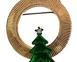 - Vintage Christmas Tree Gold Tone Ribbed Circle Wreath Pin Enamel Holiday Brooch