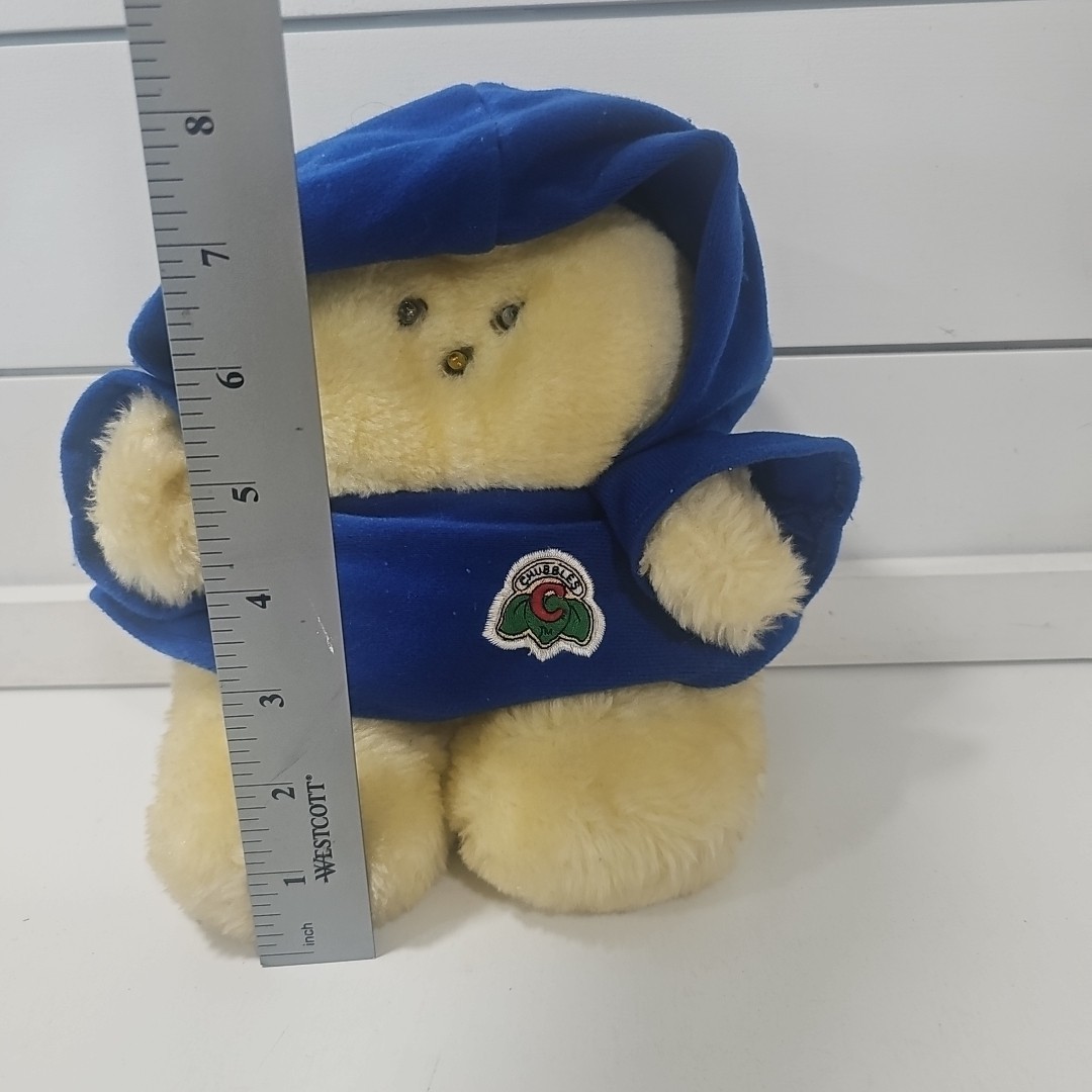 The product is a small vintage Chubbles plush stuffed animal from Animal Fair, featuring a blue cloak outfit. This collectible toy is part of the Chubbles character family.Perfect for fans of vintage toys and stuffed animals, this nostalgic piece would make a great addition to any collection or for playtime with children or adults alike.