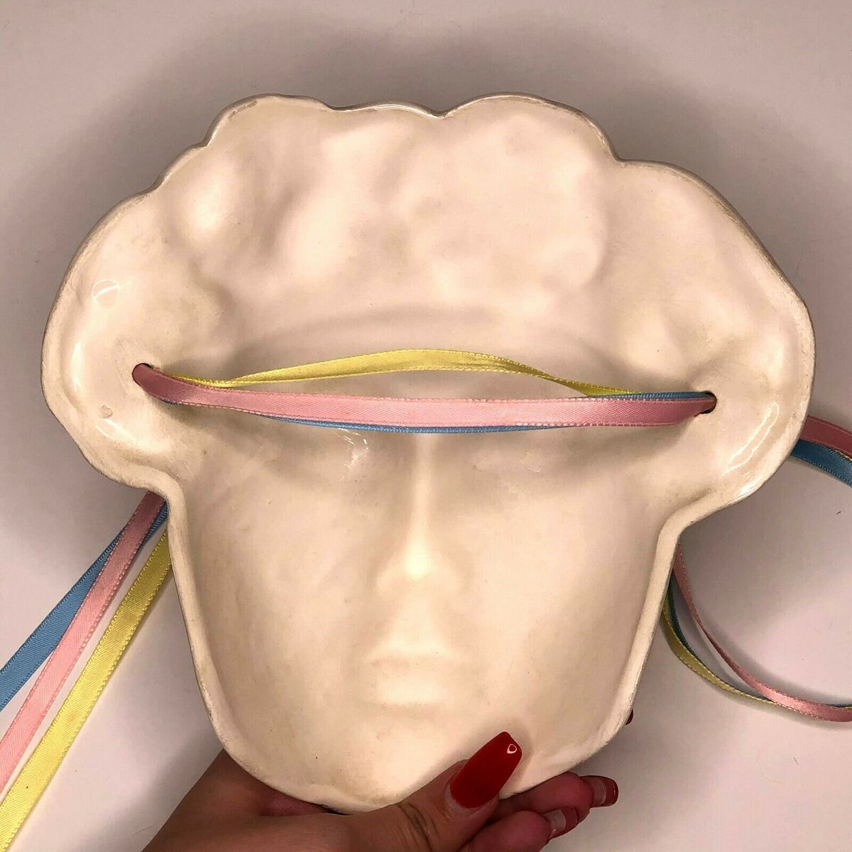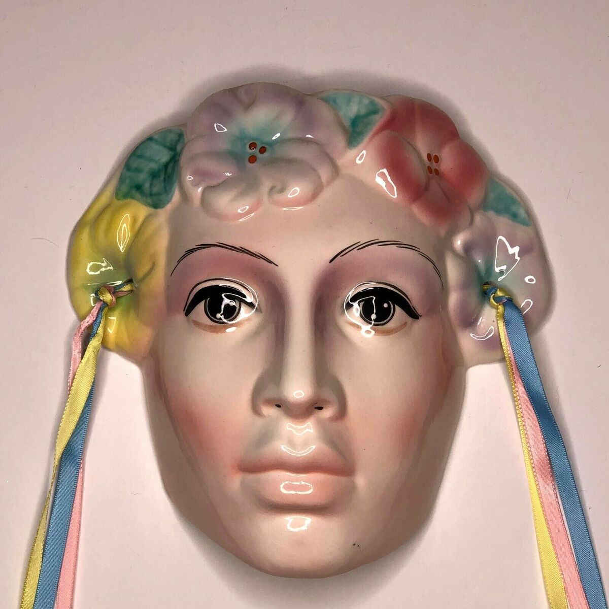 - Vintage Clay Mask Woman with Yellow Pink and Purple Flower Head Piece