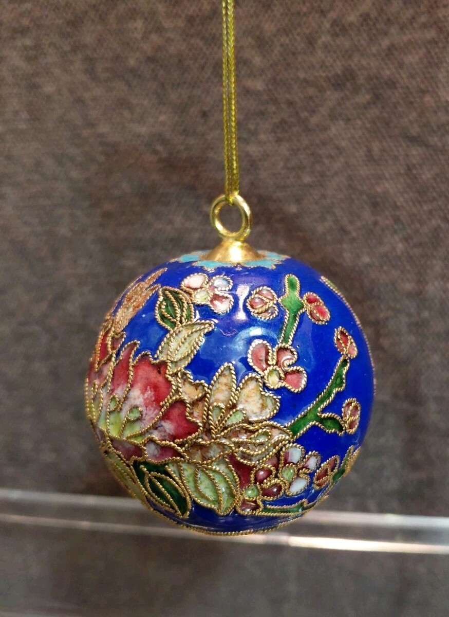 Vintage Cloisonné Floral Ball Christmas Ornament Cobalt Blue Enamel **NO BOX**