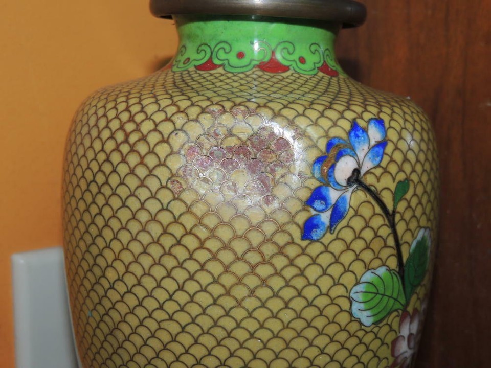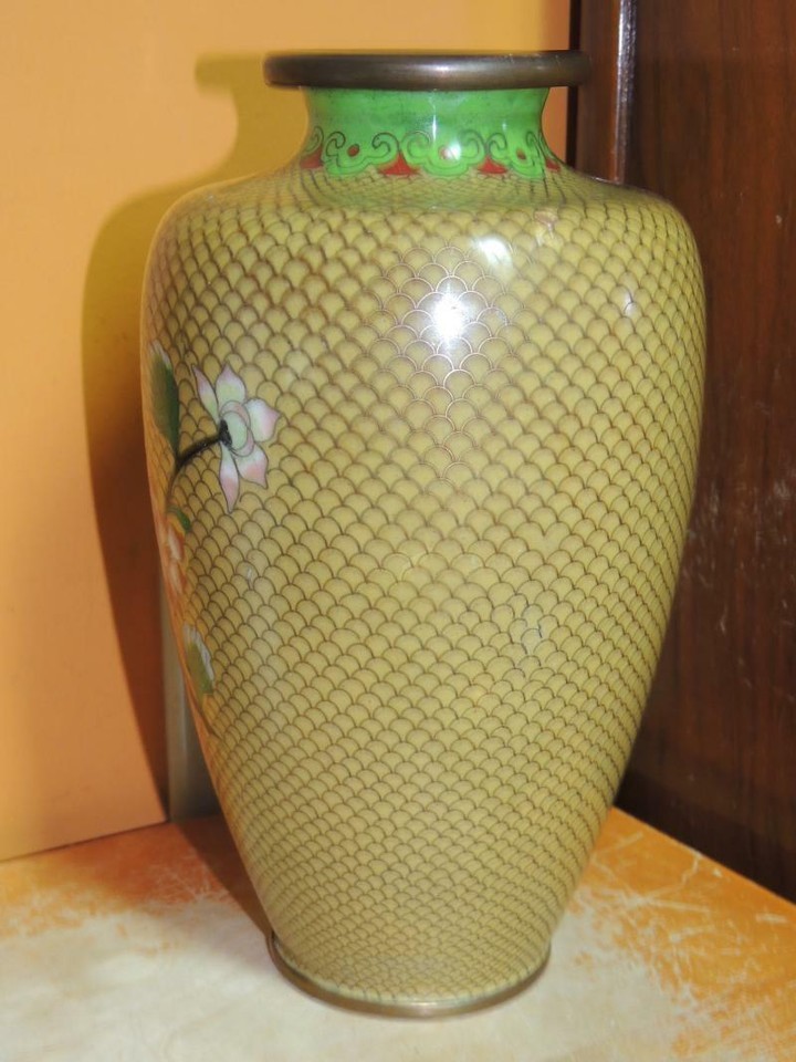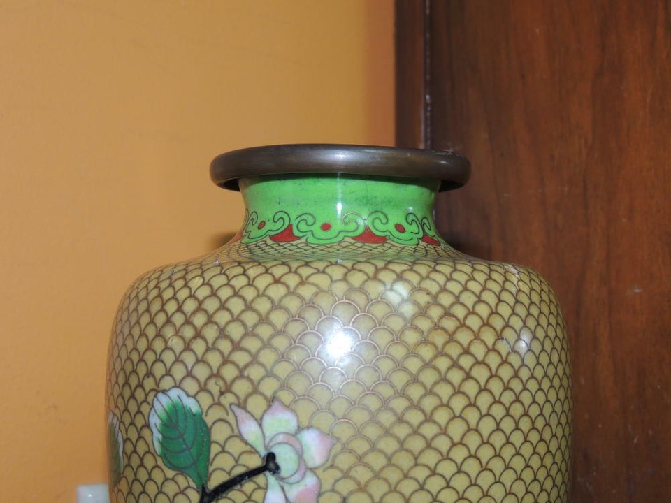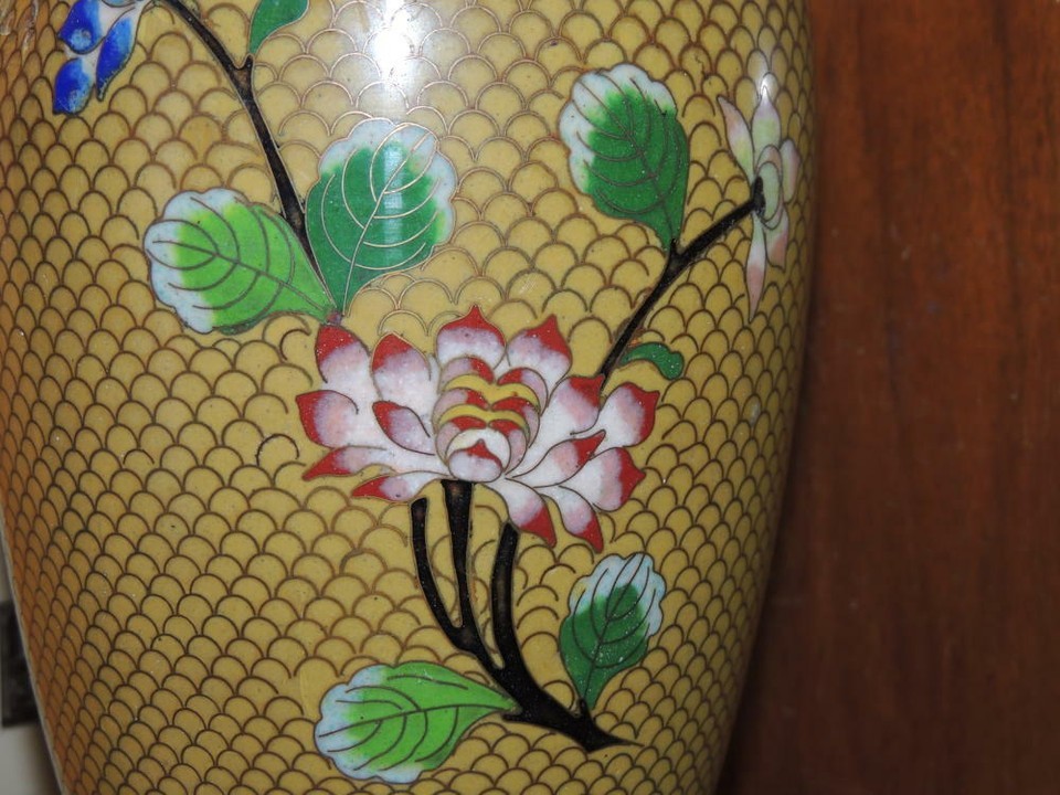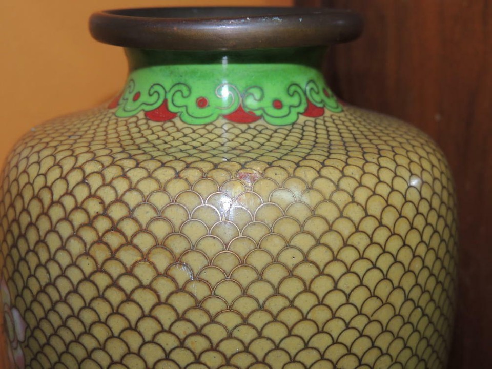 - Vintage Cloisonne 9" Vase fish scale Copper Yellow Floral Enamel DAMAGED Antique