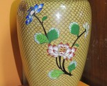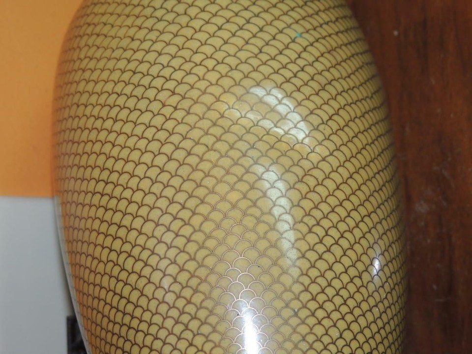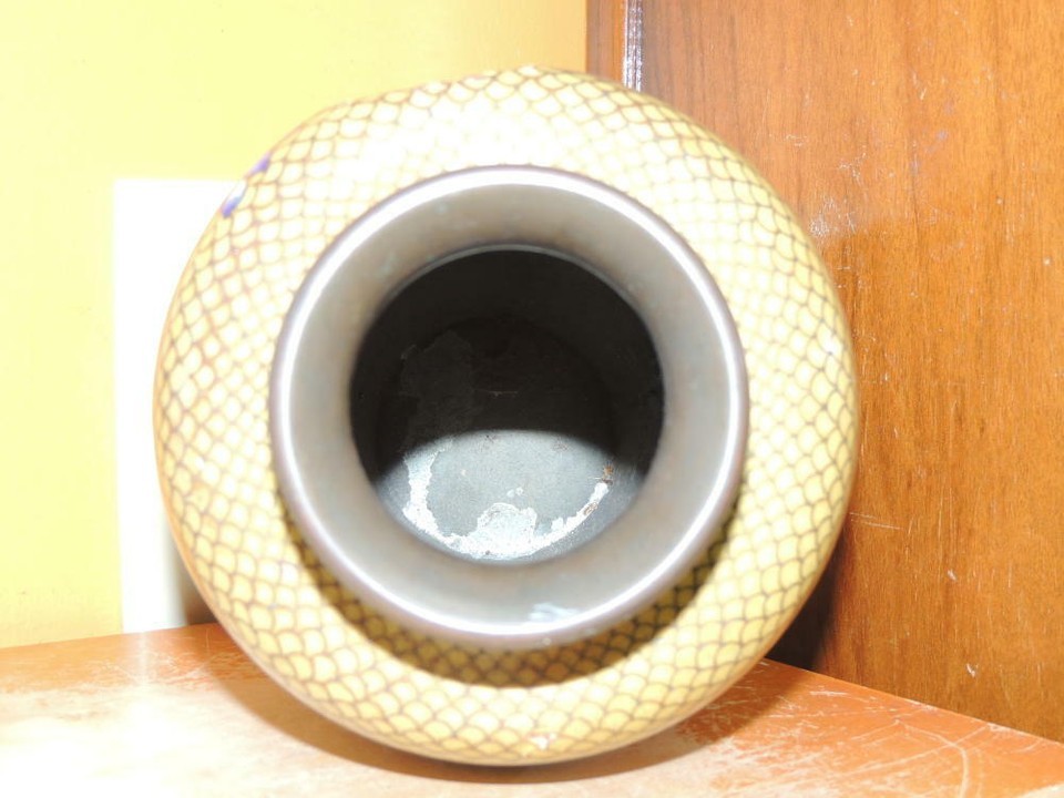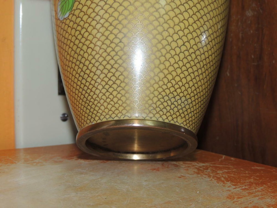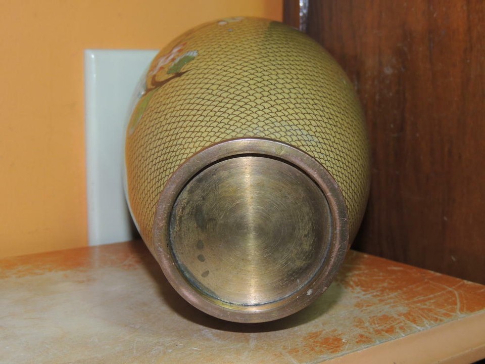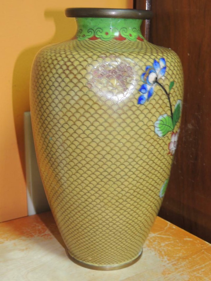 - Vintage Cloisonne 9" Vase fish scale Copper Yellow Floral Enamel DAMAGED Antique