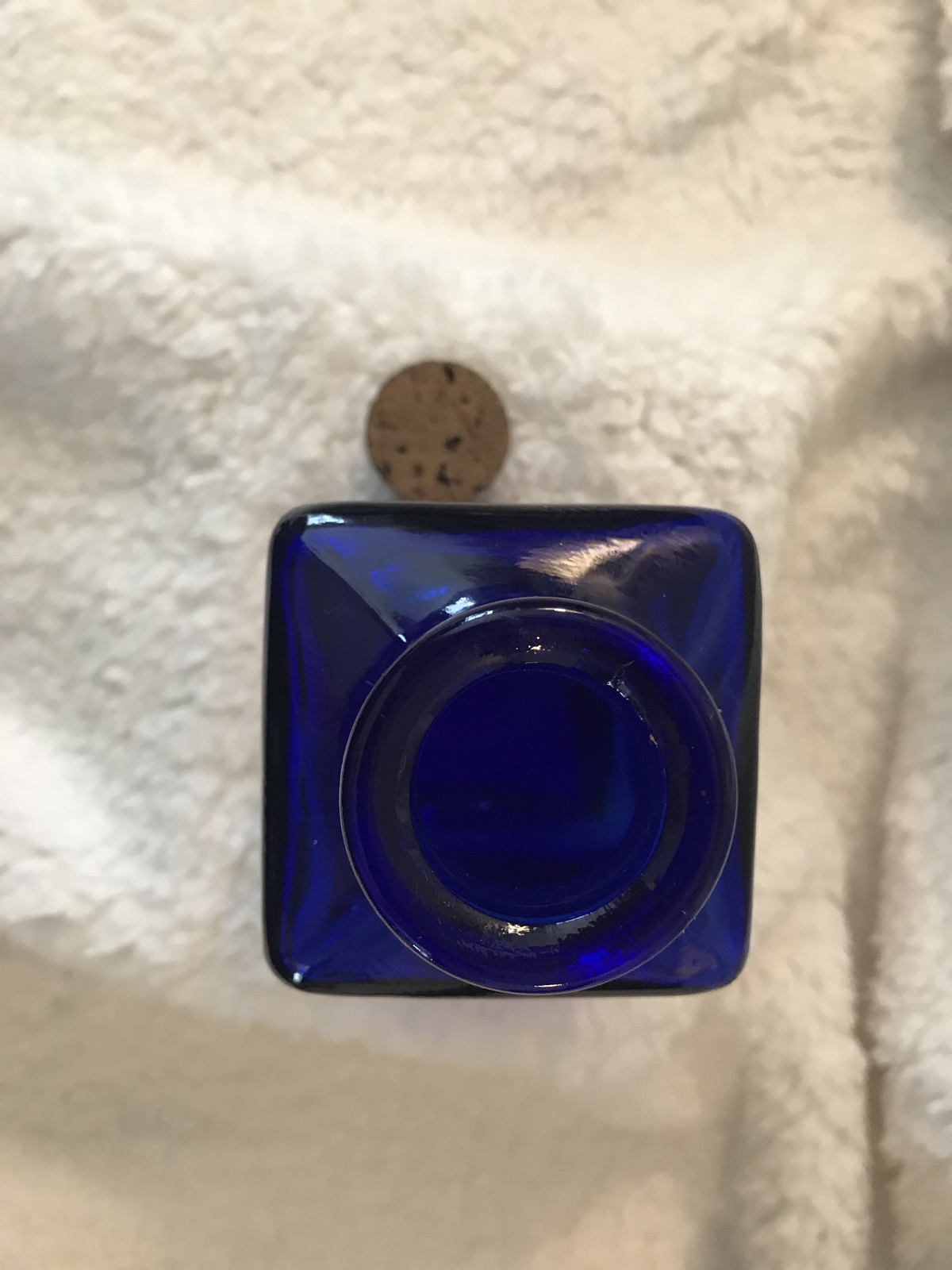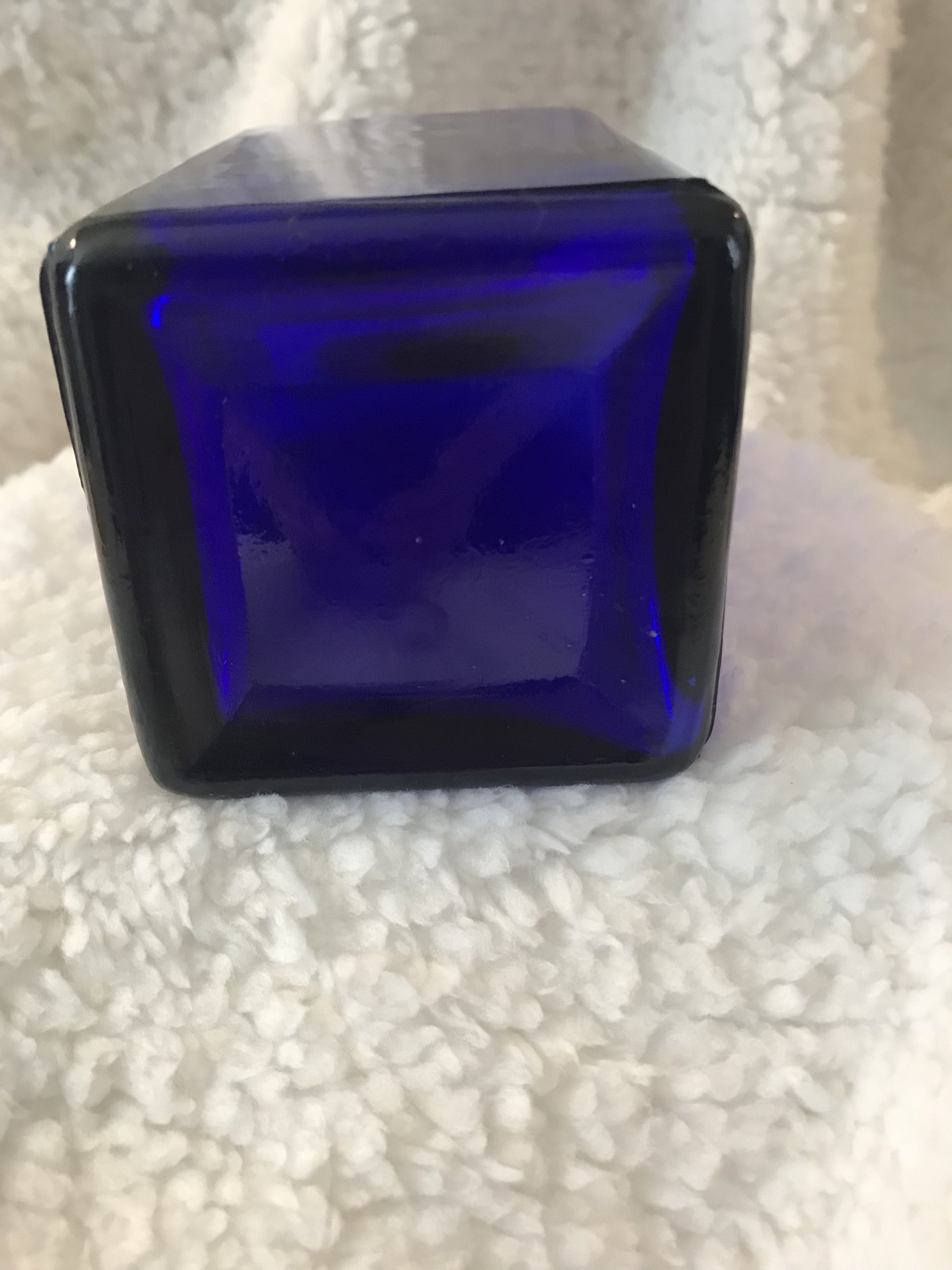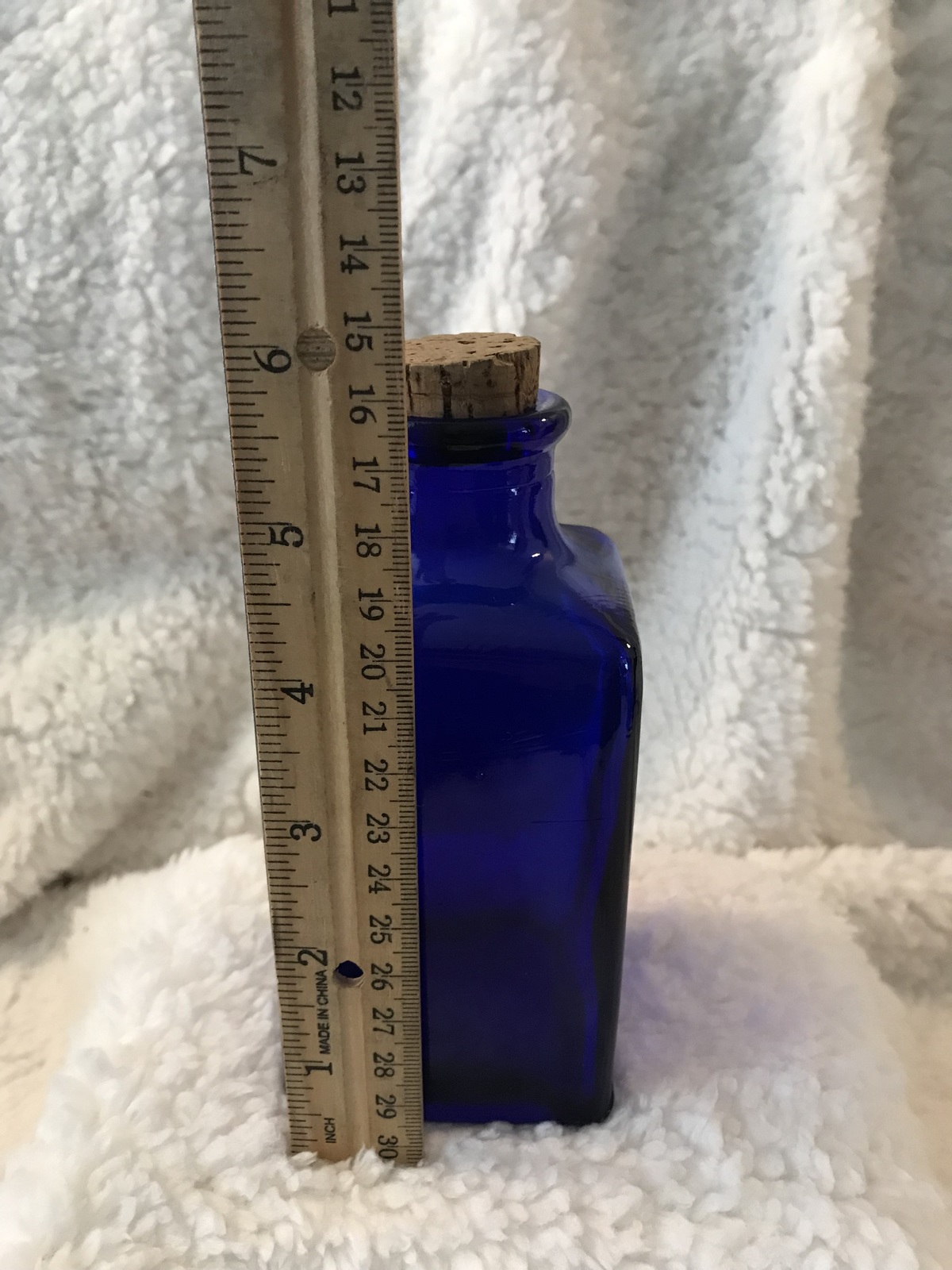 We believe this squared Cobalt to be a medicinal bottle from pictures we've seen. It's intact, no chips or scratches and with its very old original cork, amazing. We think that she's a beauty, what do you think?