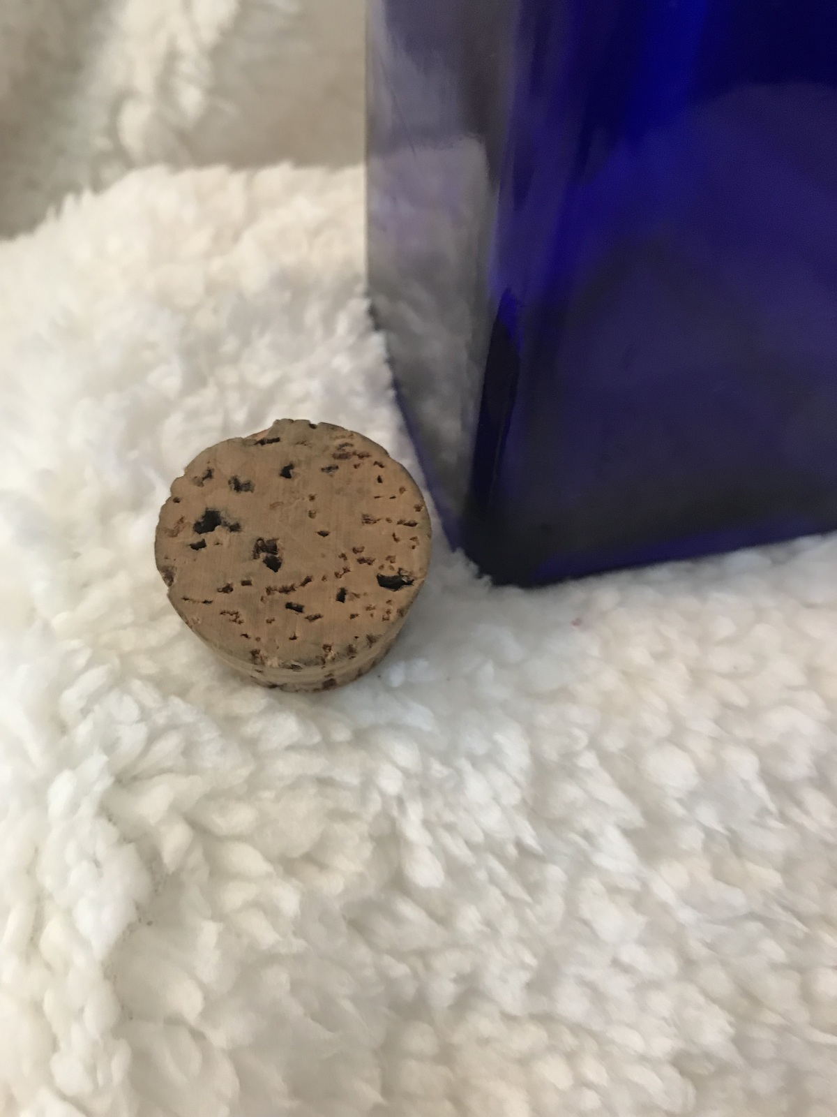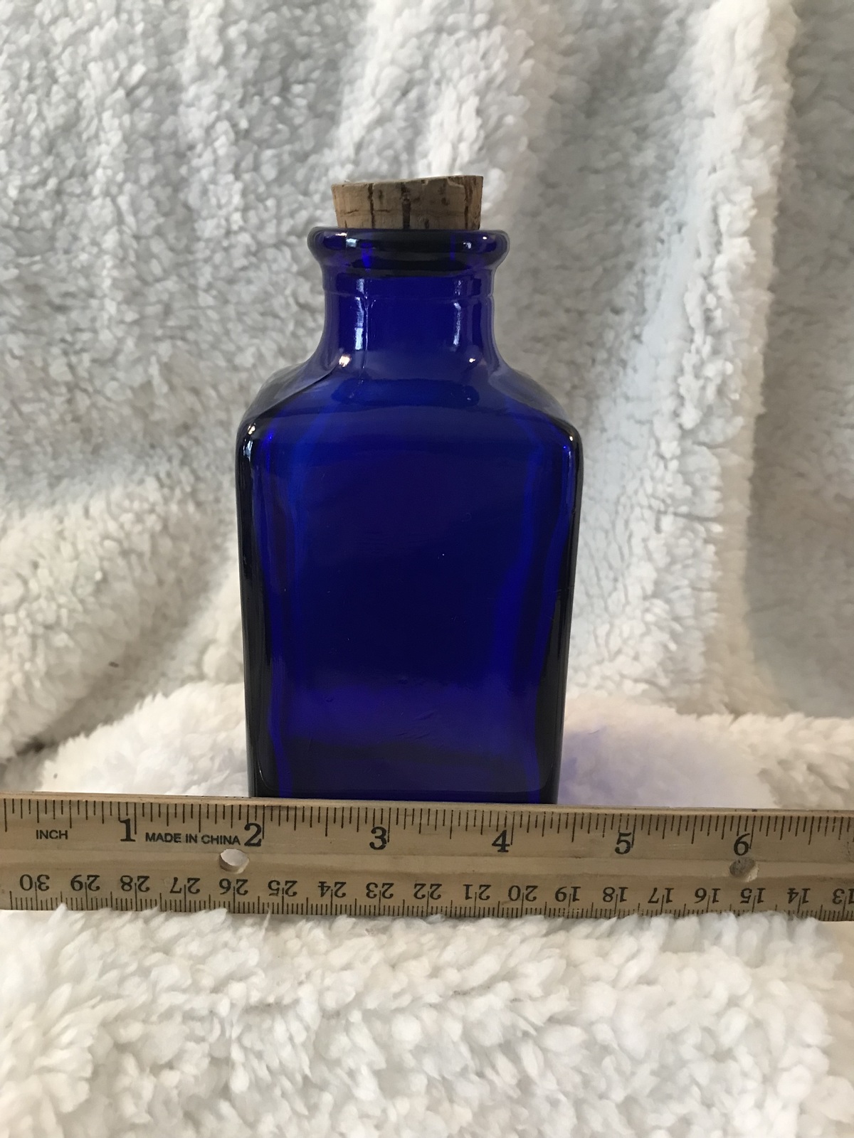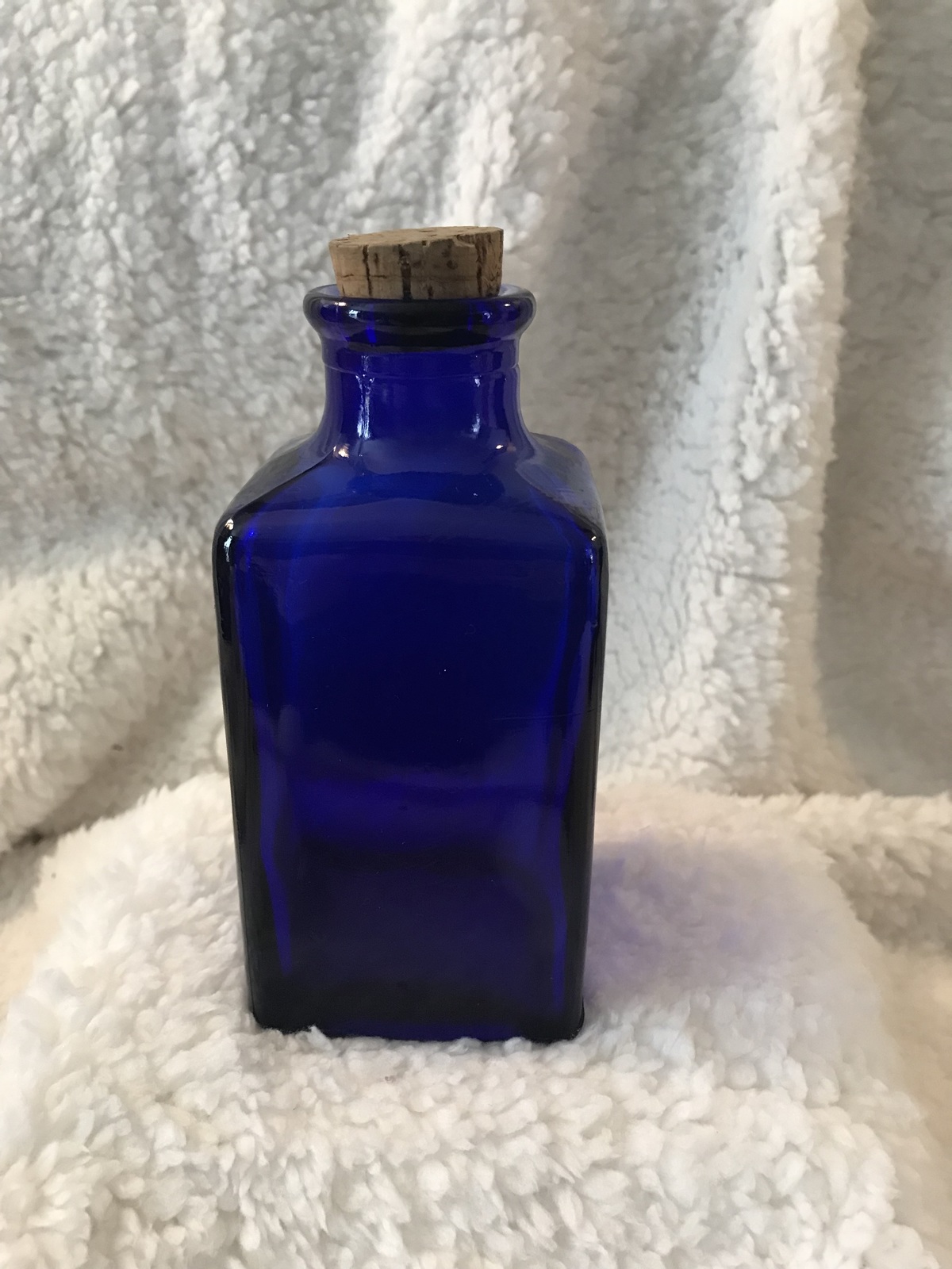 We believe this squared Cobalt to be a medicinal bottle from pictures we've seen. It's intact, no chips or scratches and with its very old original cork, amazing. We think that she's a beauty, what do you think?