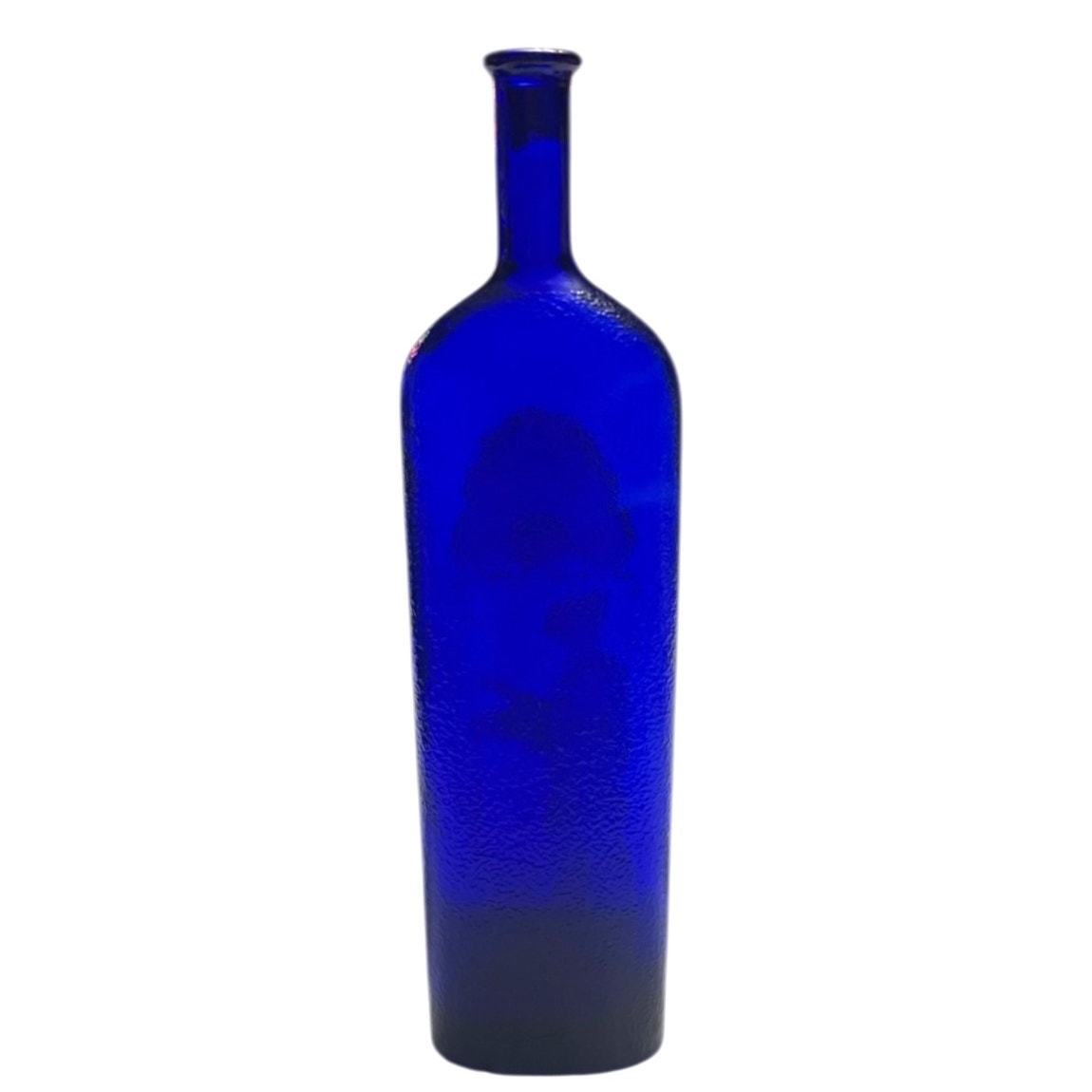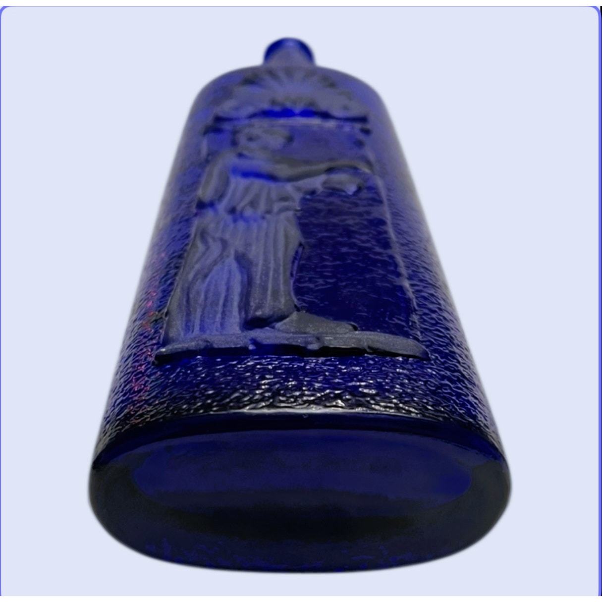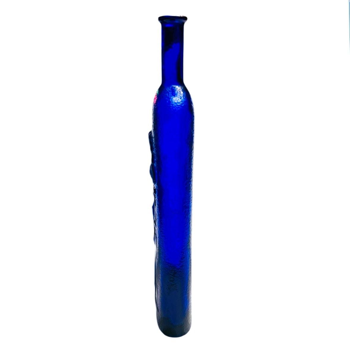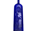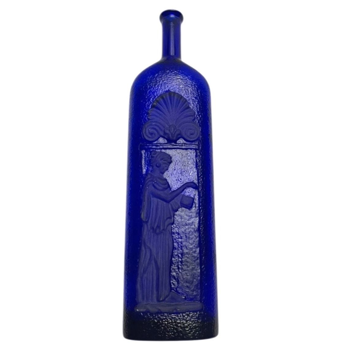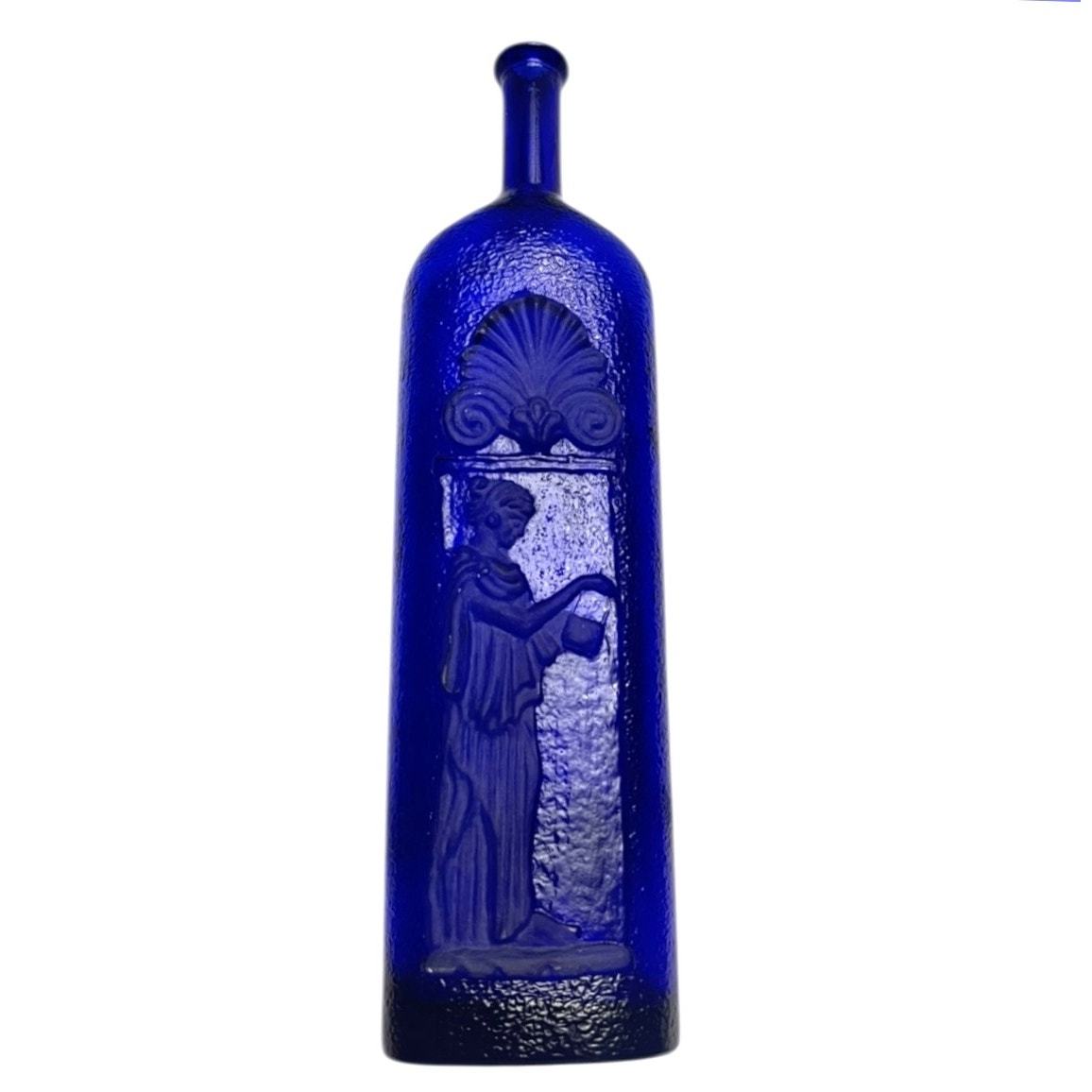 Vintage Cobalt Blue Embossed Textured Glass Bottle w/Greek Woman Design (1970s) RARE. Beautiful vintage bottle features a rich cobalt blue color, textured, frosted embossed Greek woman and scalloped fan design. Measures 12 1/4" tall, 3 1/4" wide, 1" across top, 2 1/4" neck on the bottle. Bottle is in excellent vintage condition, no cracks, breaks, chips, or scratches. Comes from a smoke free, pet free home.