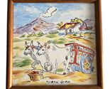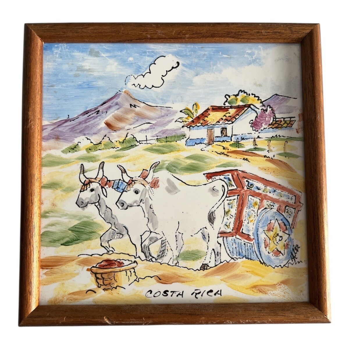 - Vintage Costa Rica Hand-Painted Ceramic Tile Art Ox Cart Scene Framed 7”