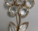 This elegant brooch holds eleven 10mm round-cut, prong-set crystals in an understated goldtone setting. The graceful stem is adorned with two 8mm x 15mm 0marquise-cut crystal leaves. The 1-1/2" pin bar has a secure, working rollover clasp. The brooch measures 2-3/4" long by 1-1/4" at the widest point. This unsigned beauty is a real sparkler as it catches the light.
