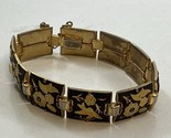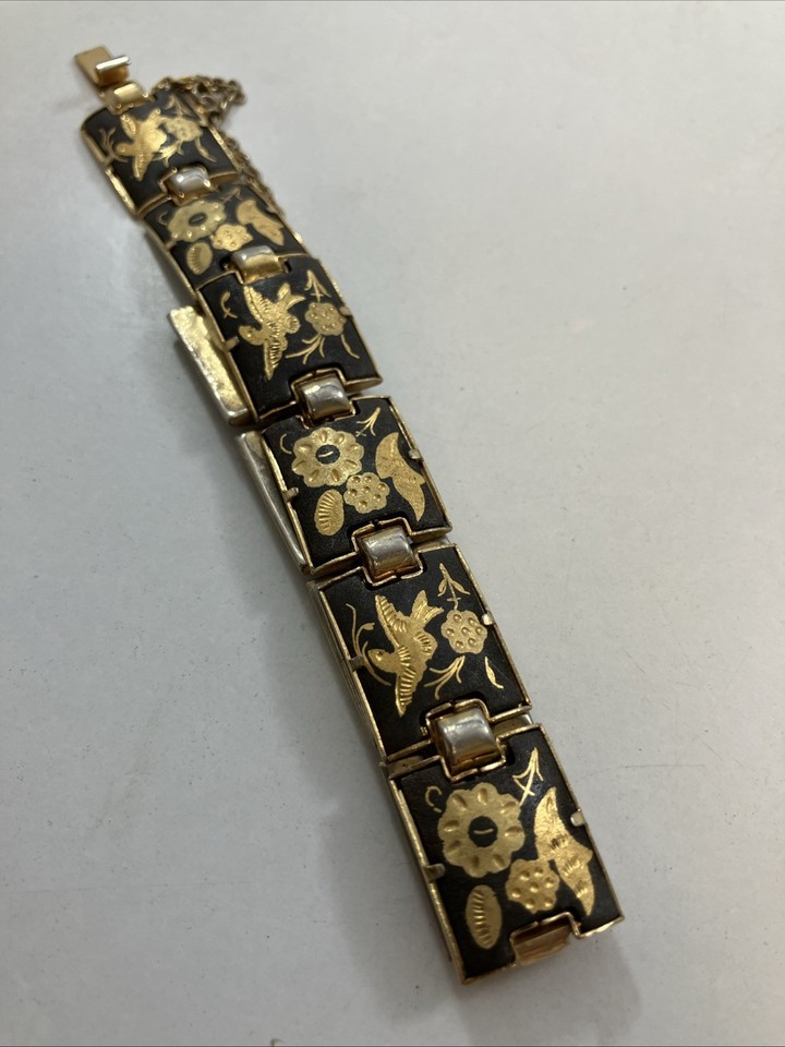 - Vintage Damascene Panel Link 7” Long Bracelet Birds & Flowers Motif