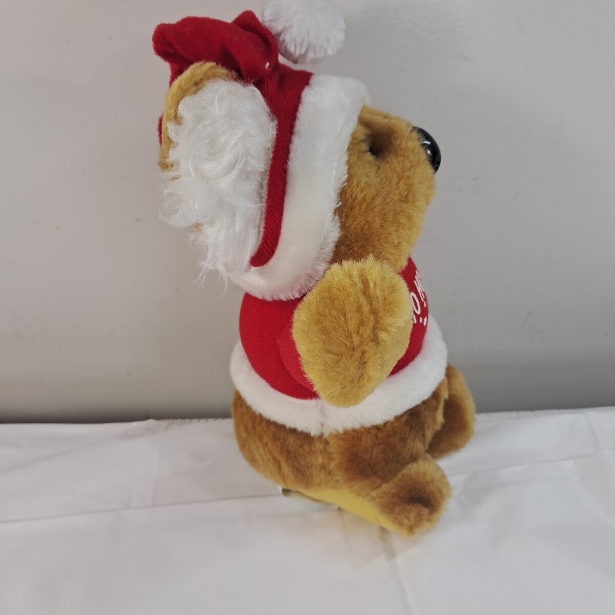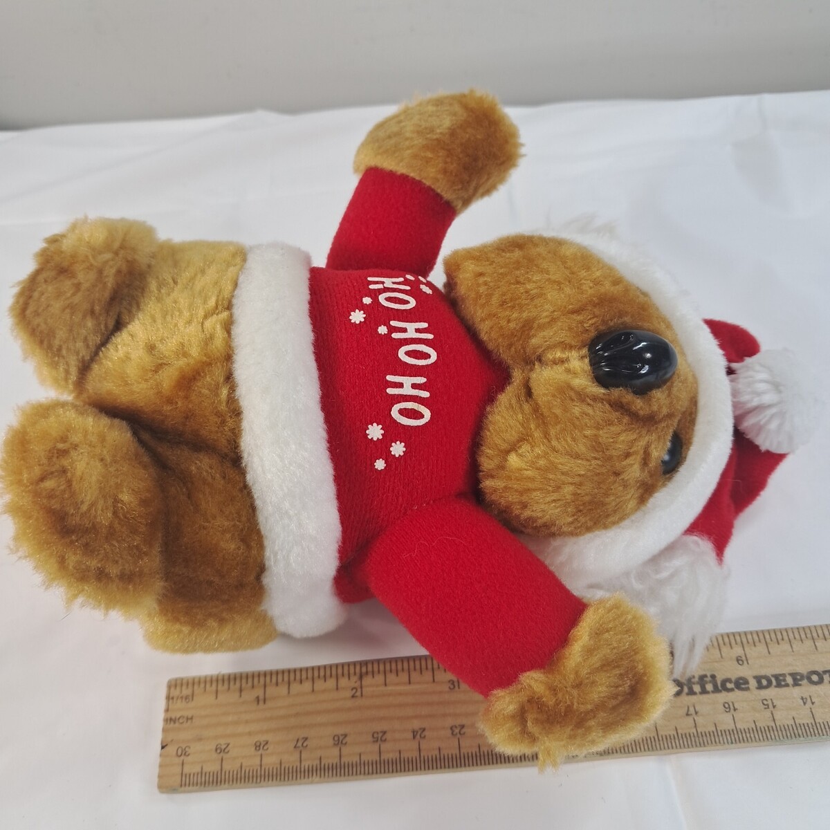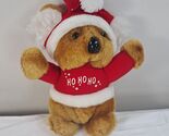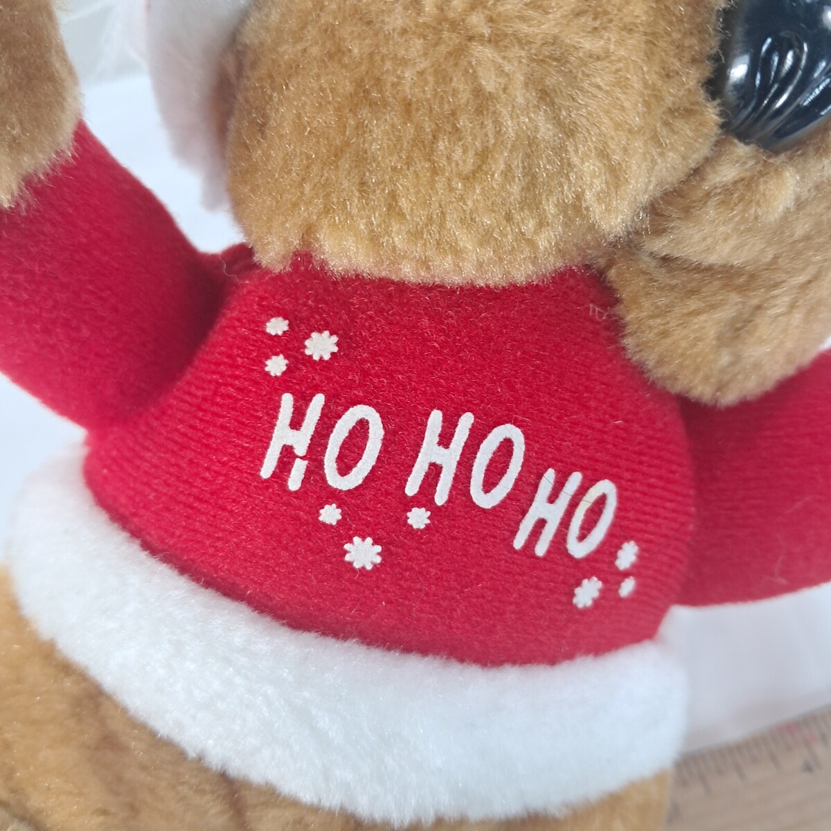 Small brown bear wearing red sweater that says Ho Ho Ho and Santa hat. Bottom is discolored as shown. Good condition otherwise. See pics.