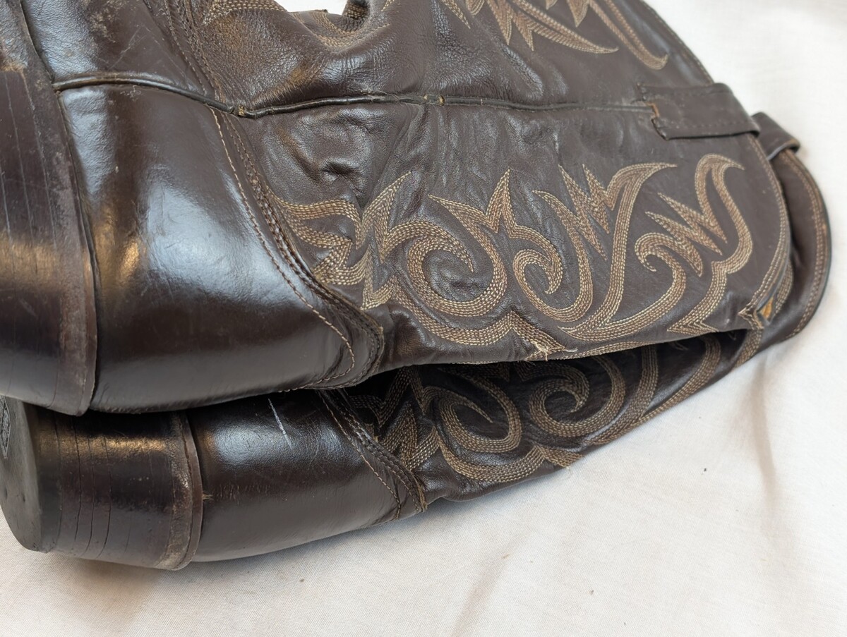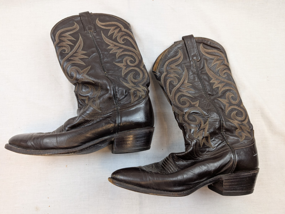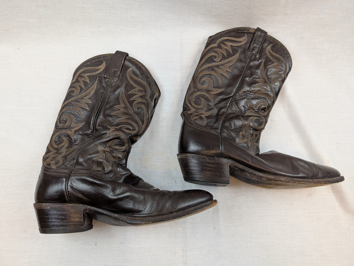 Up for sale is a pair of Vintage Dan Post Mens Size 10 EW Dark Brown Leather Western Cowboy Boots P2301