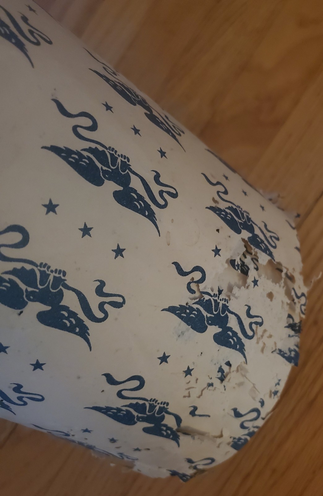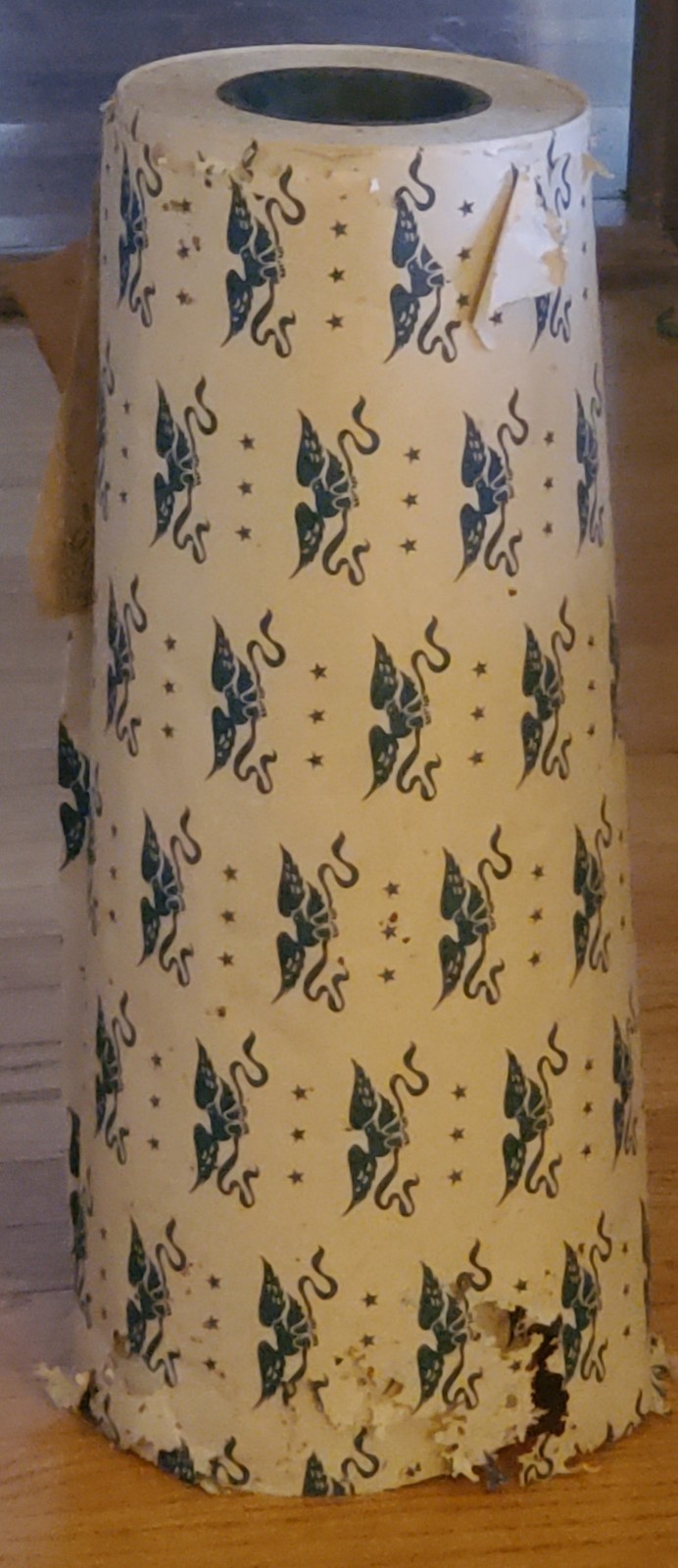 Opened Roll of vintage Gift wrapping paper. This Roll is 18" and weighs almost 10 pounds. The outside is discolored due to age and there is critter damage as well. I've seen this pattern used as backing on antique paintings. A wonderful nostalgic graphic.