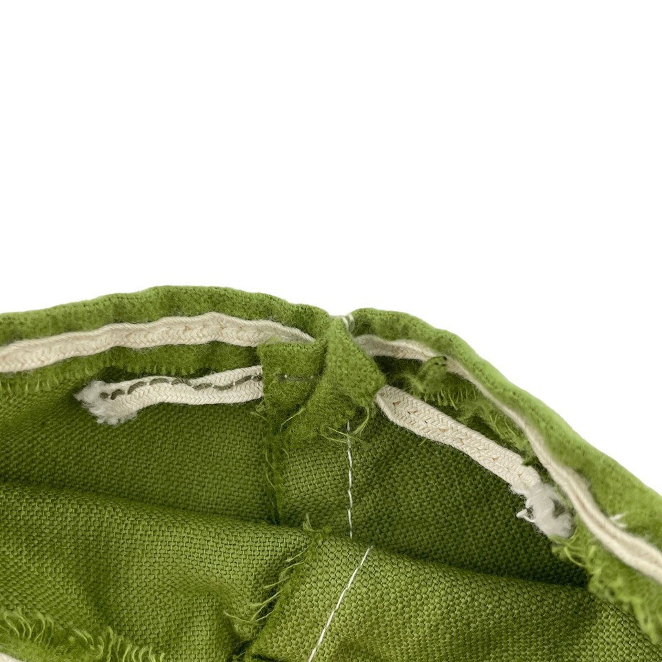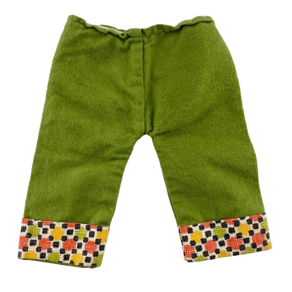 Green fleece pants with cuffs that match the print on top. Elastic waist is 6" across front. Length is 9.5"