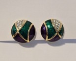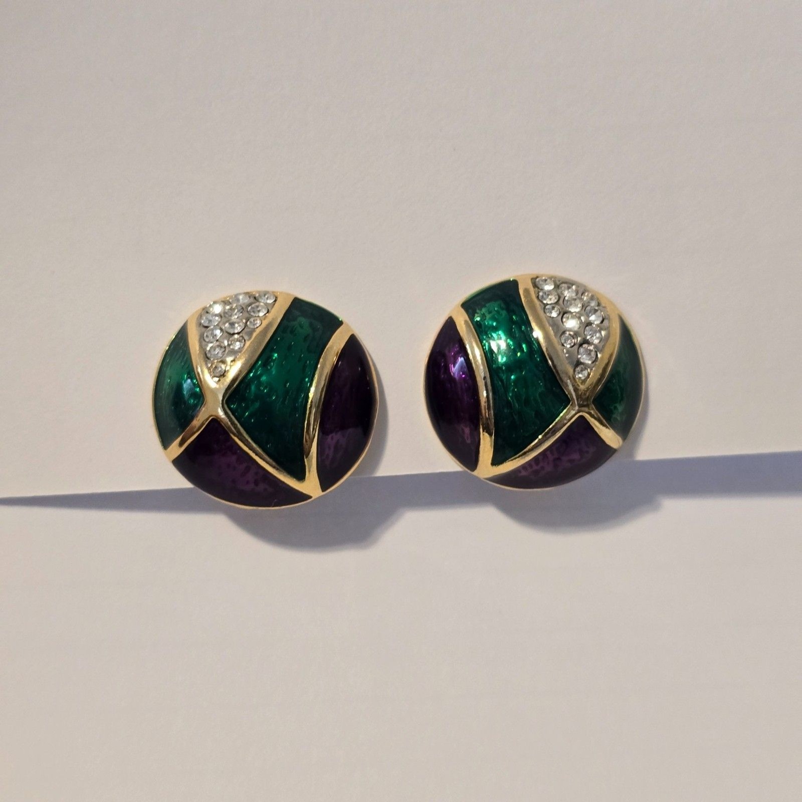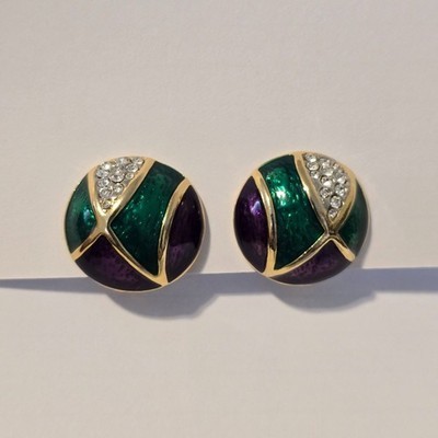 - Vintage Dome Enamel Rhinestone Earrings Purple & Green Geometric Gold Tone