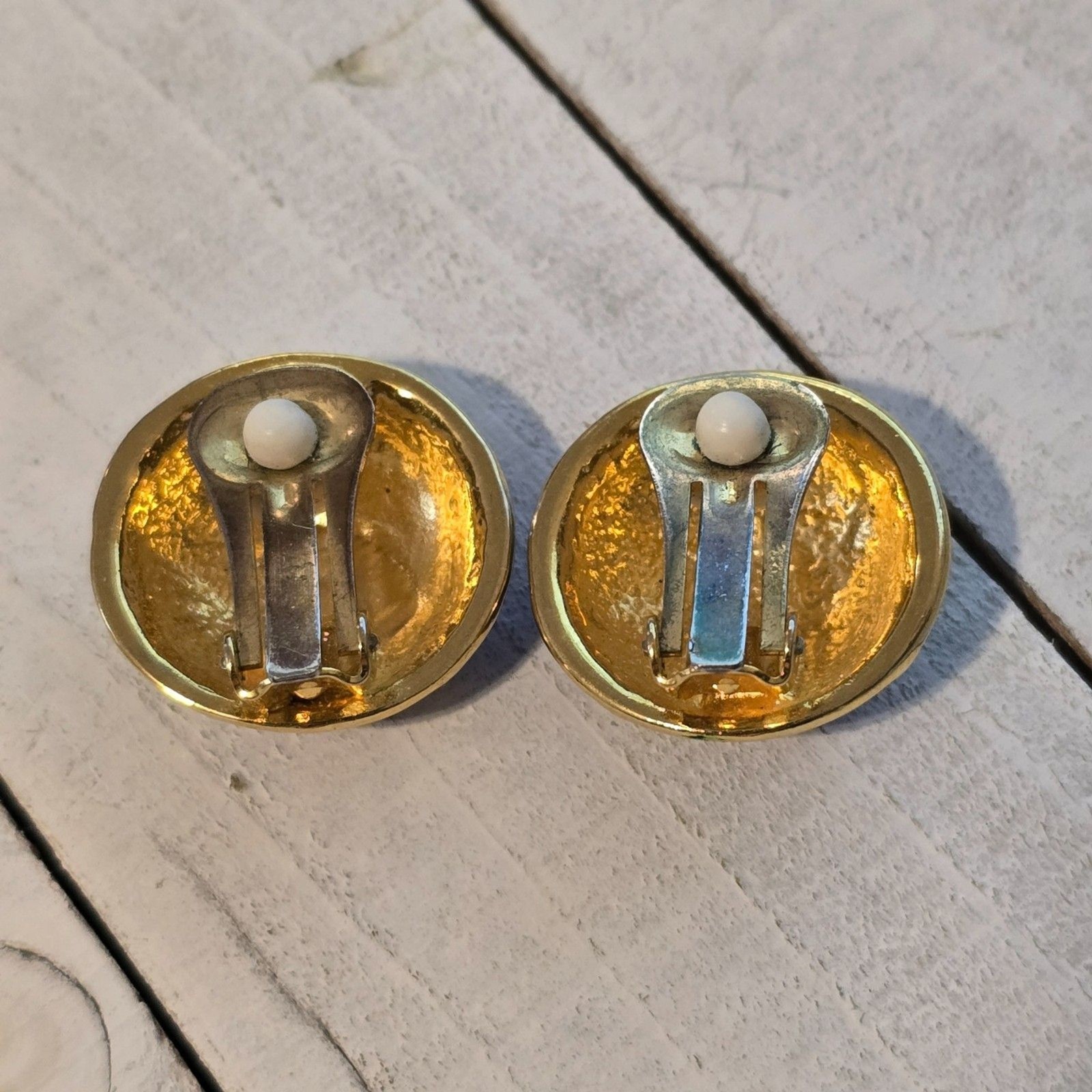 These vintage earrings feature a bold round dome design with rich green and purple enamel panels, accented by sparkling clear rhinestones in a gold-tone setting. Their geometric style and dimensional look make them perfect for adding a pop of vintage glamour to any outfit.