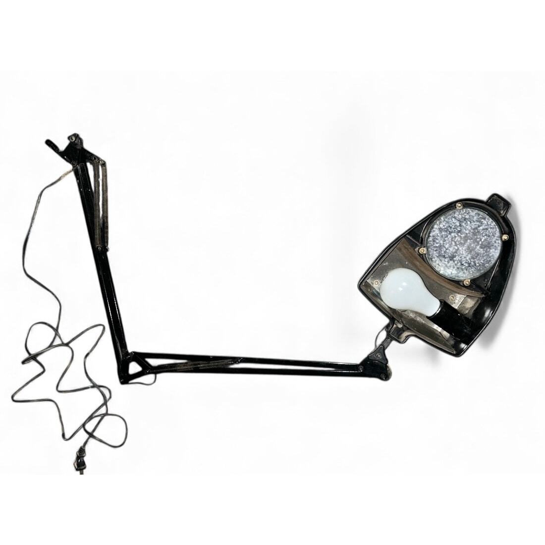 Not sure how old it is but guessing from the style possibly 1950's. Still fully working, threw a bulb in there just to test (was higher than 40W so it got hot pretty quickly) but that's the 2nd picture where you can see the light through it. Still moves and works perfectly well, can magnify and although I'm not sure how it mounts, I'm sure it does! It was in my late fathers shed and I cleaned it up a bit from the decades of sawdust but in pretty immaculate condition for the age!