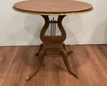 For sale is a vintage Duncan Phyfe style oval side or end table with harp base. It?s been highlighted with a painted top and gold trim. 2 metal feet caps are missing, but the area where it was has been painted to match the other 2.