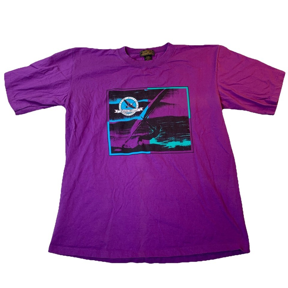 Vintage 1980s Eddie Bauer Outdoor Outfitter T-shirt with bold windsurf graphic and vibrant purple colorway.