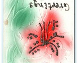 This exquisite vintage postcard features a delicately embossed floral design highlighted with vibrant red and green airbrushed colors and sparkling black glitter details. The intricate embossing adds a tactile dimension, enhancing the visual appeal of the flower motif. The postcard is a printed lithograph on paper with a chrome finish, typical of early 20th-century production techniques.