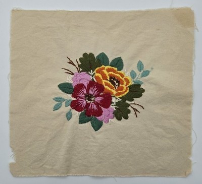 Lovely vintage textile art featuring colorful floral embroidery in red, pink, orange, yellow, brown, and green tones ? a beautifully handmade piece perfect for framing or display.