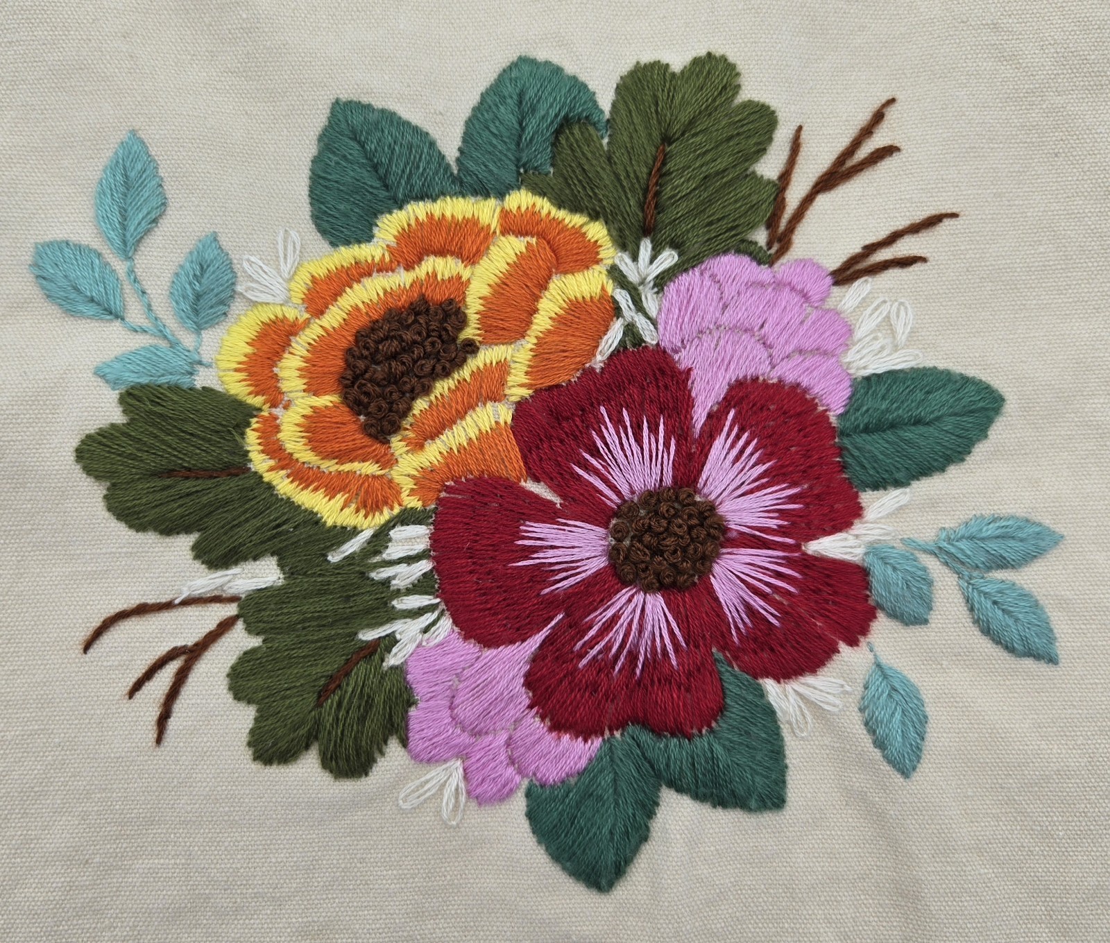 ? Stitched in red, pink, orange, yellow, brown, and green threads