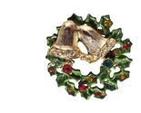 - Vintage Enamel Christmas Wreath with Bell Pin Brooch Holly Berries Jewelry