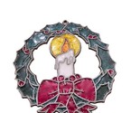 Beautiful vintage enamel metal Christmas wreath suncatcher, featuring candle, holly, and red bow details.