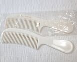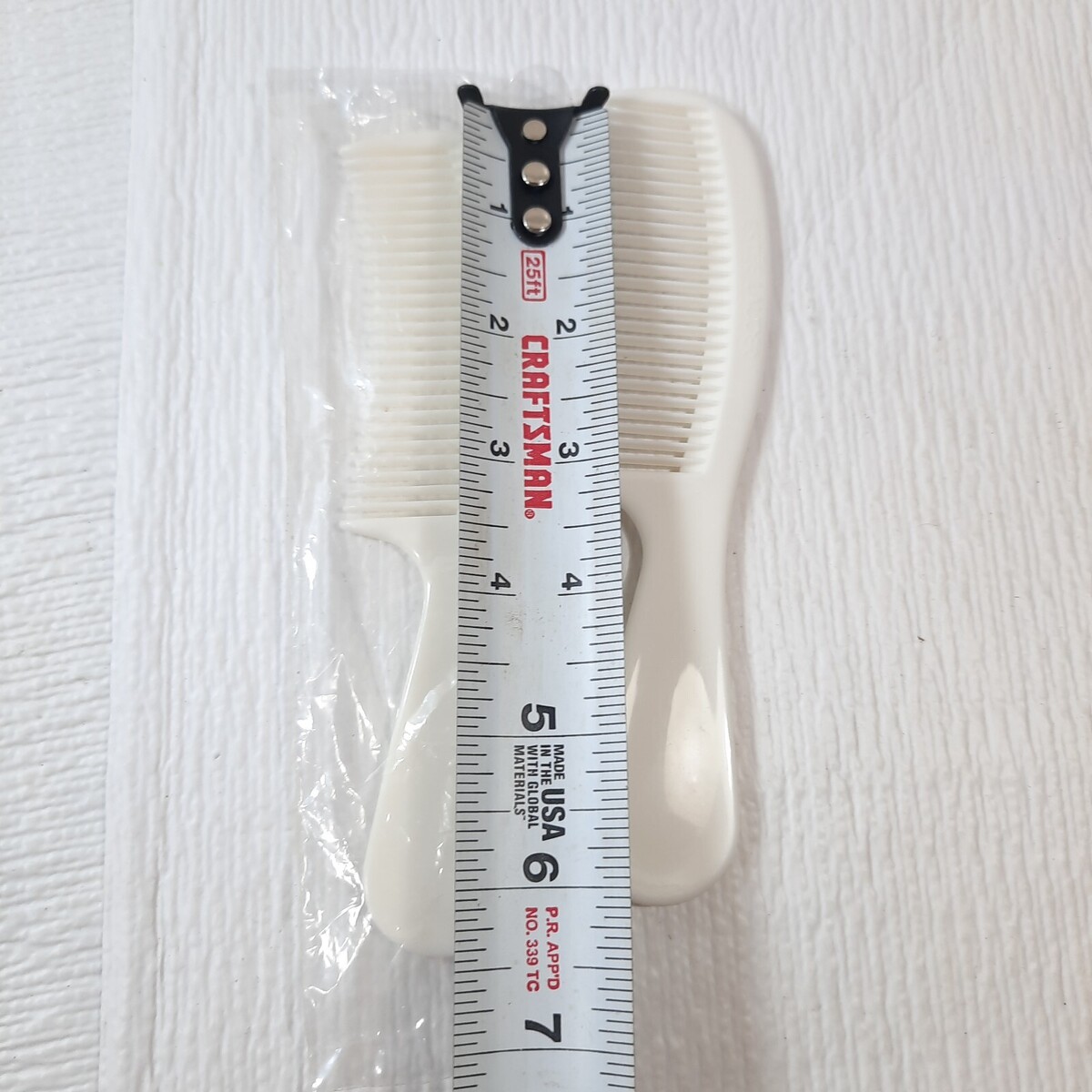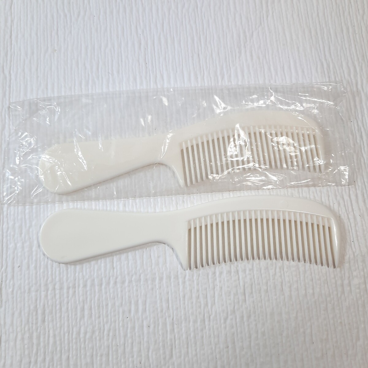 Hard plastic combs. One has a silver logo. One comb is still wrapped in plastic.