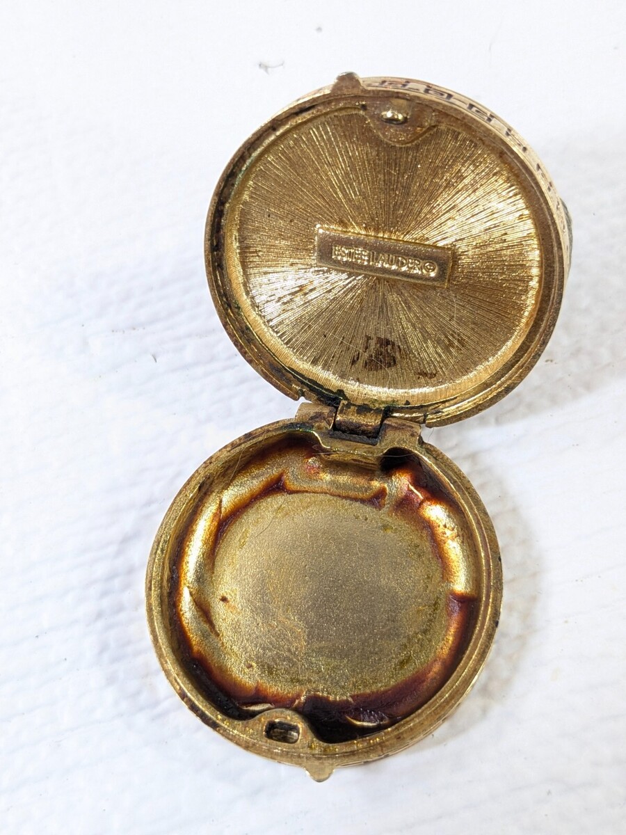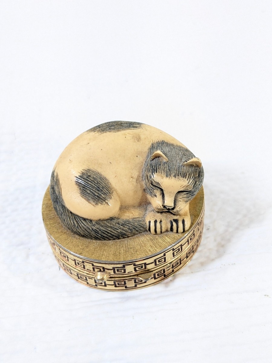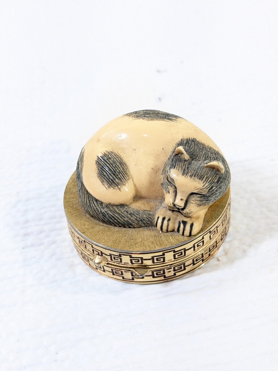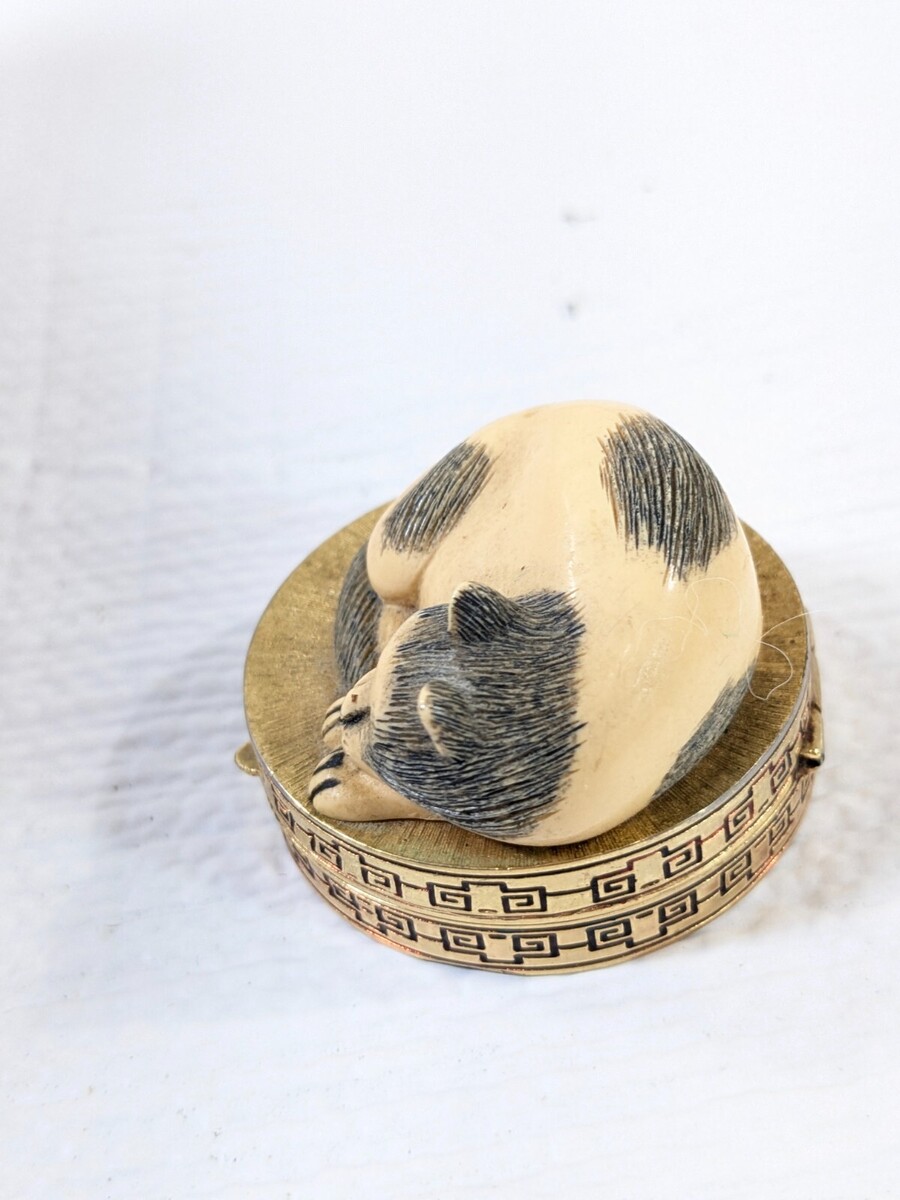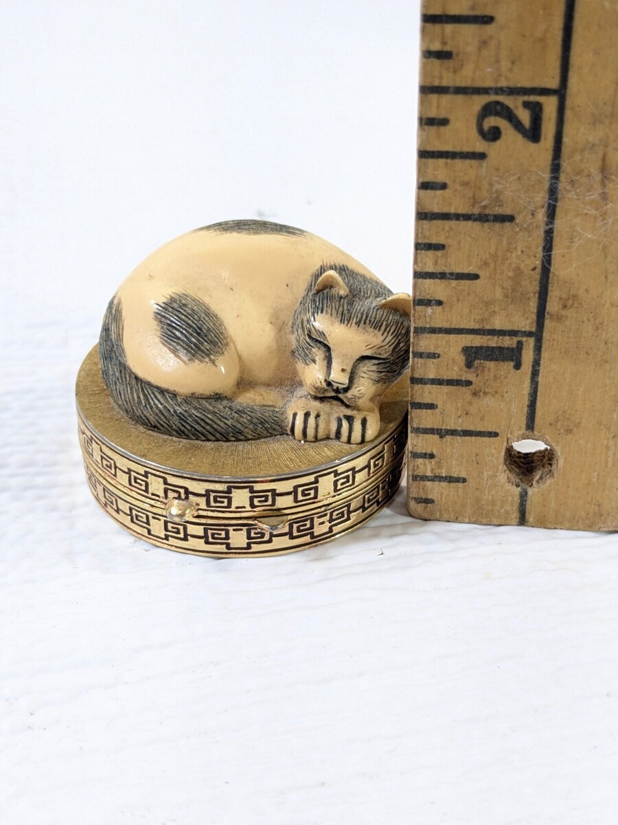 COMPACT IS EMPTY. Gold tone with ivory tone sleeping cat. Some minor wear as shown. See pics.