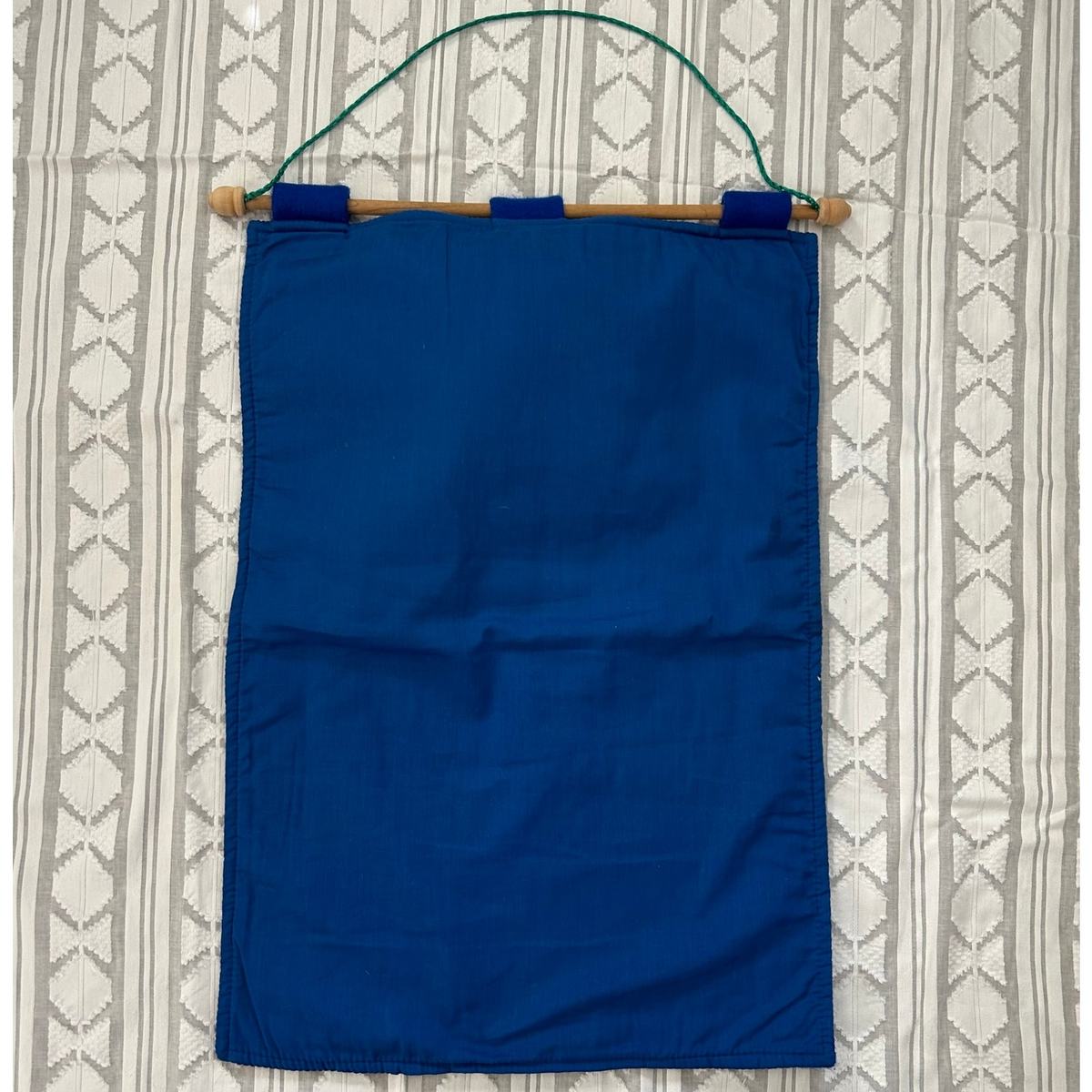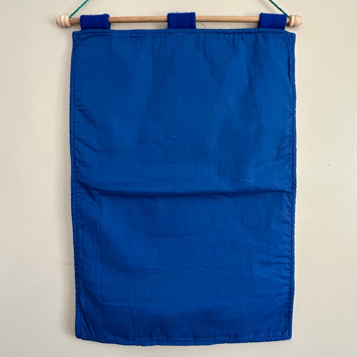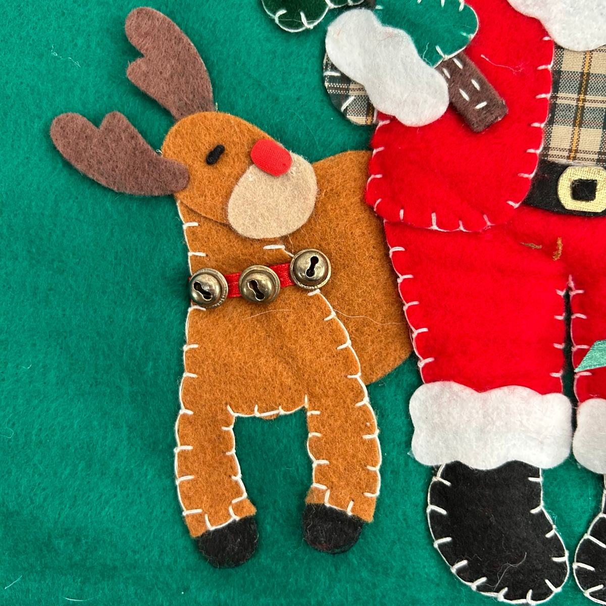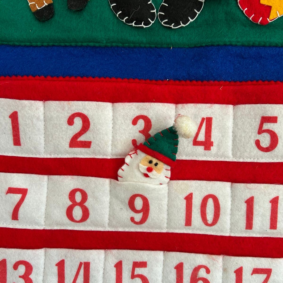 Charming vintage felt Christmas Advent calendar featuring Santa, a reindeer, gifts, and ?NOEL? applique letters. Fully stitched felt panel with 24 numbered pockets and a movable snowman marker to countdown the days. Bright colors, sequins, and classic 1980s?1990s handmade holiday style. Hangs easily from the attached wooden dowel.