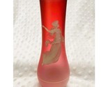 Vintage Fenton Cranberry Ombre Glass, Mary Gregory Cameo Hand Painted Vase 1970s. Beautiful vase features ombre cranberry frosted glass, hand painted flowing woman holding a cornucopia, and falling flowers. tapers to fuller base. Measures 8 5/8" tall, top rim is 2 1/8" across, 3 1/4" across at widest point. Bottom of vase also has handpainted circle. In excellent vintage condition, no cracks, breaks or chips. Bottom contains some small surface imperfections. Comes from a smoke free, pet free home.
