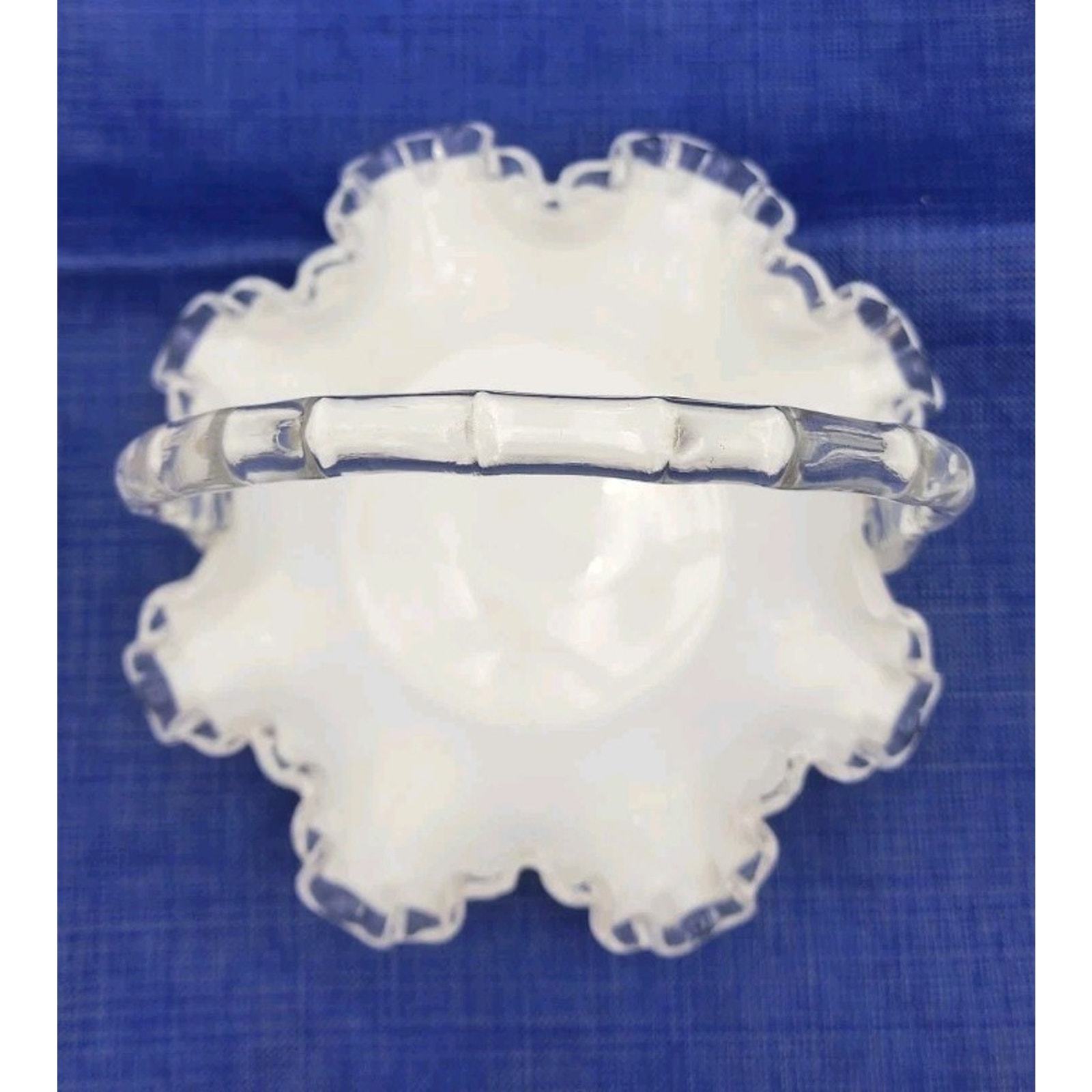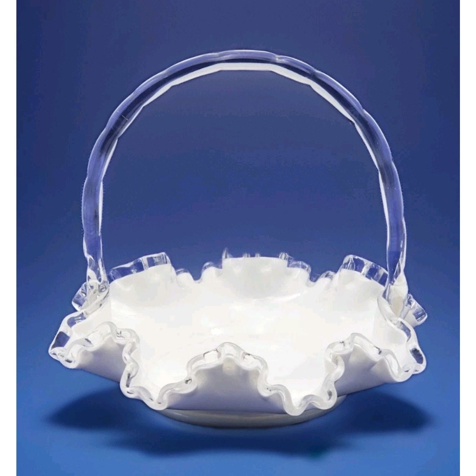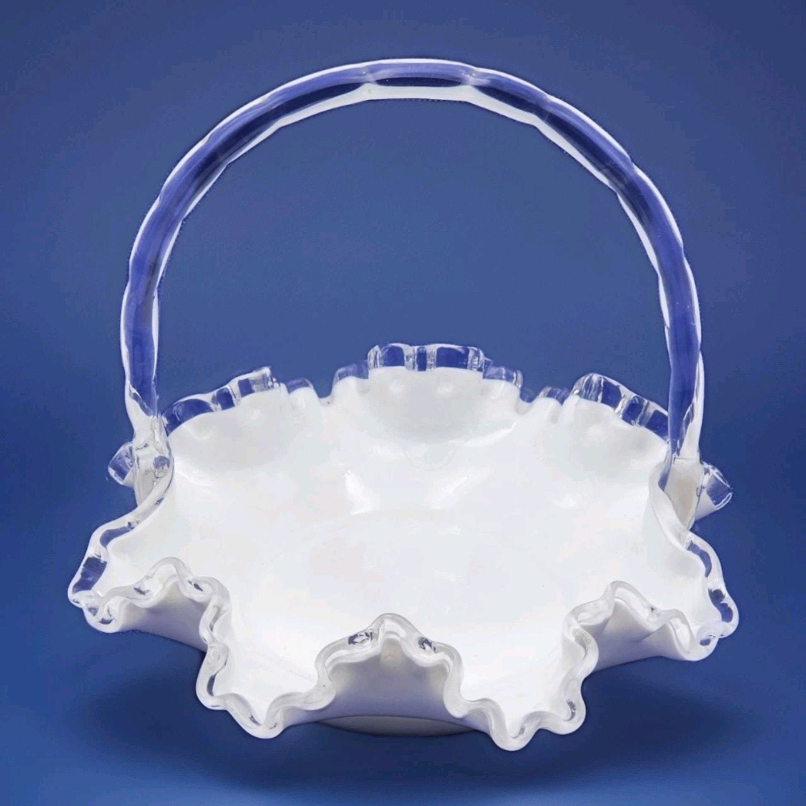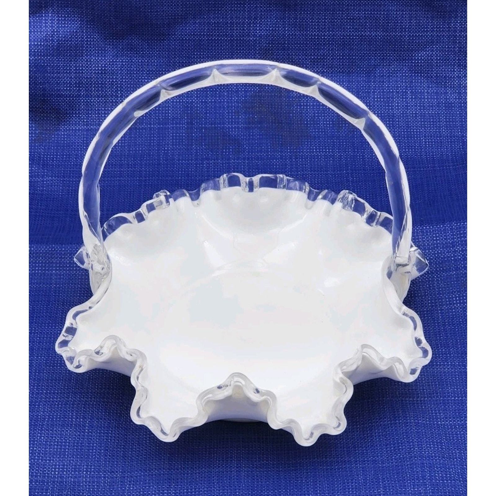 - Vintage Fenton Crystal Crest White Milk Glass 7.5" Basket Ruffled Clear Handle