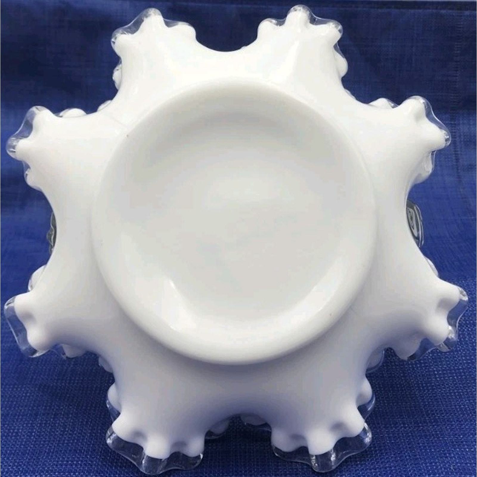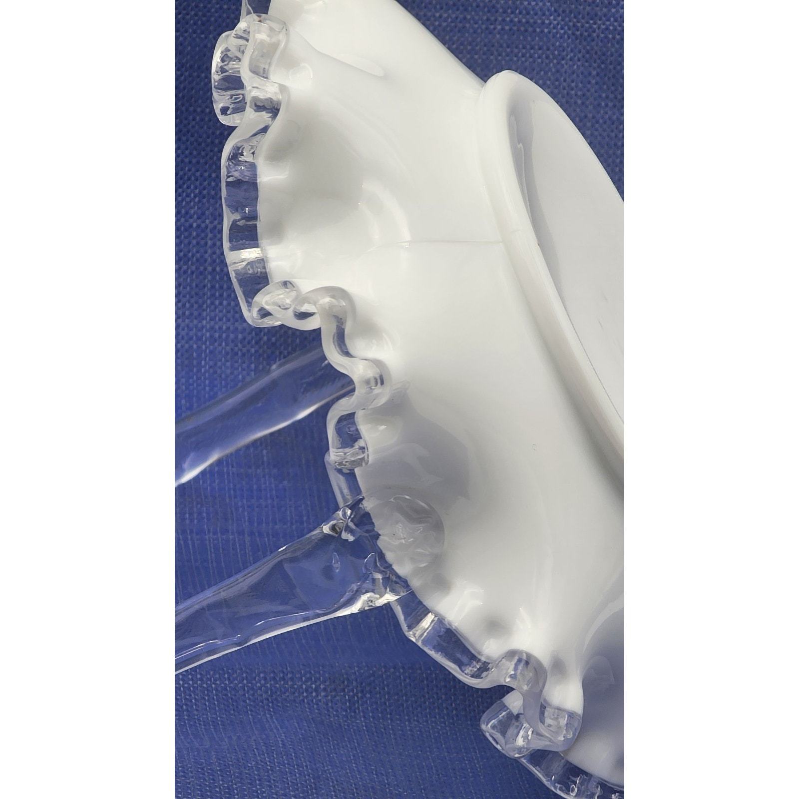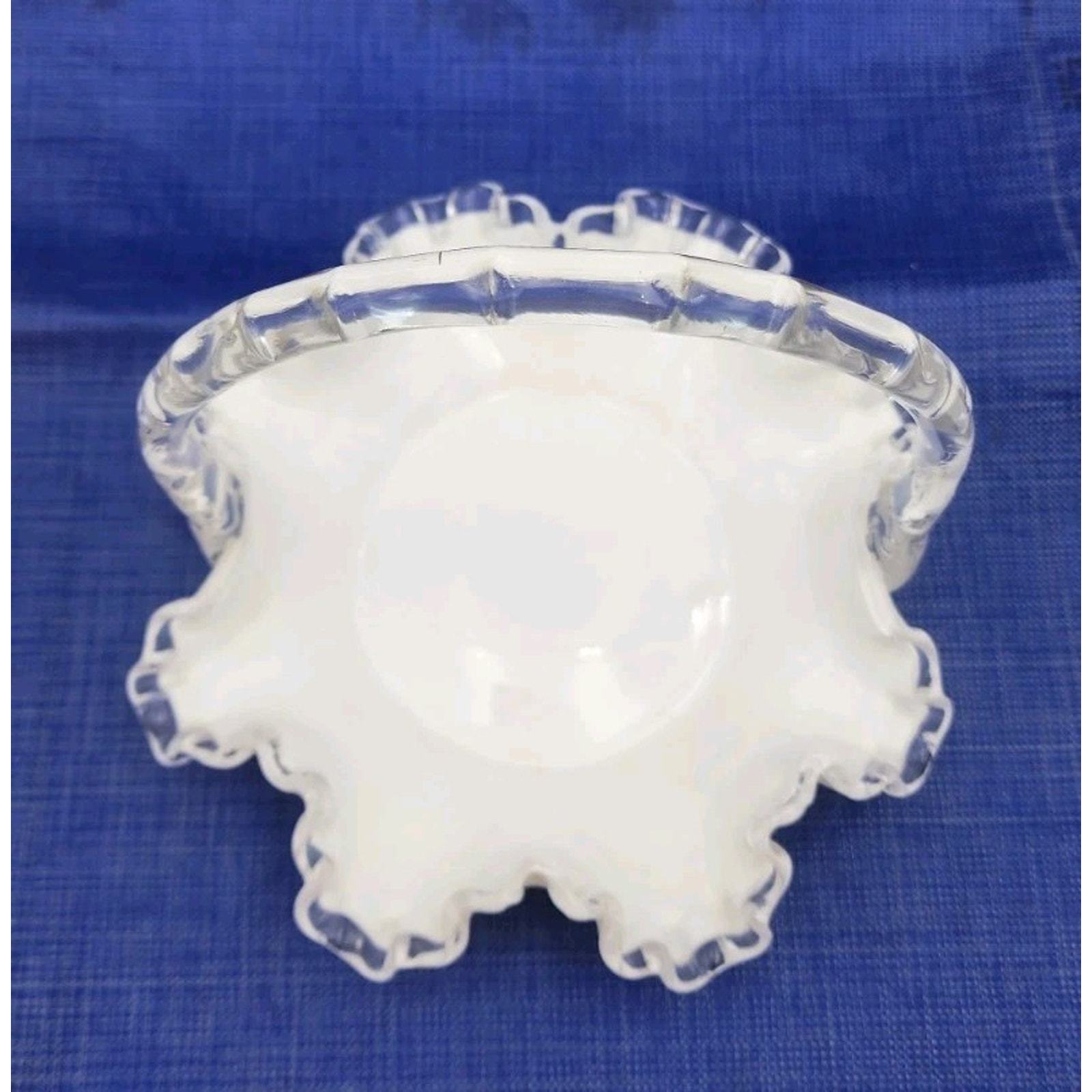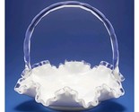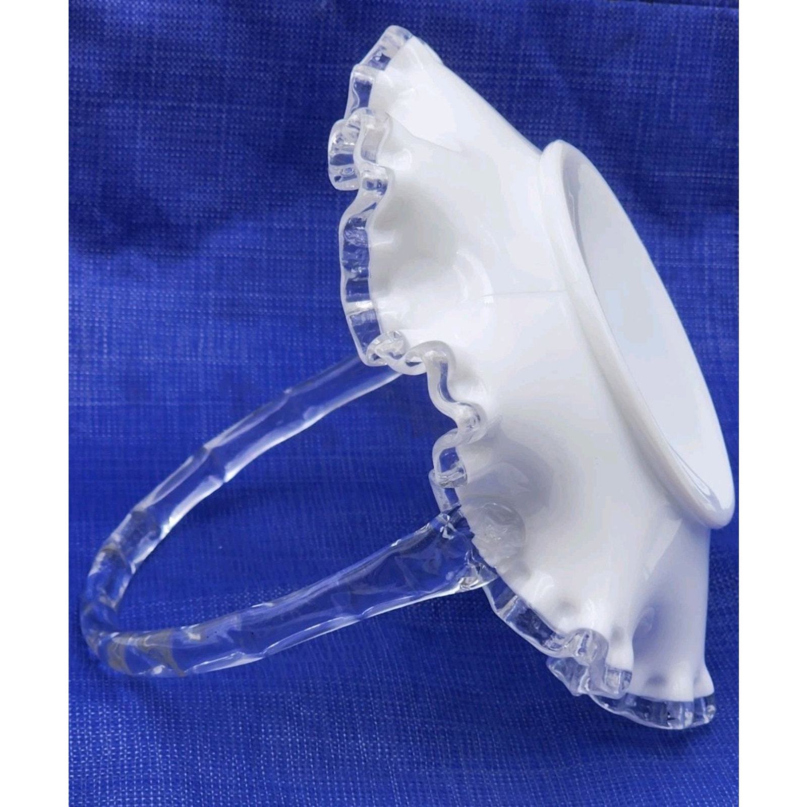 - Vintage Fenton Crystal Crest White Milk Glass 7.5" Basket Ruffled Clear Handle
