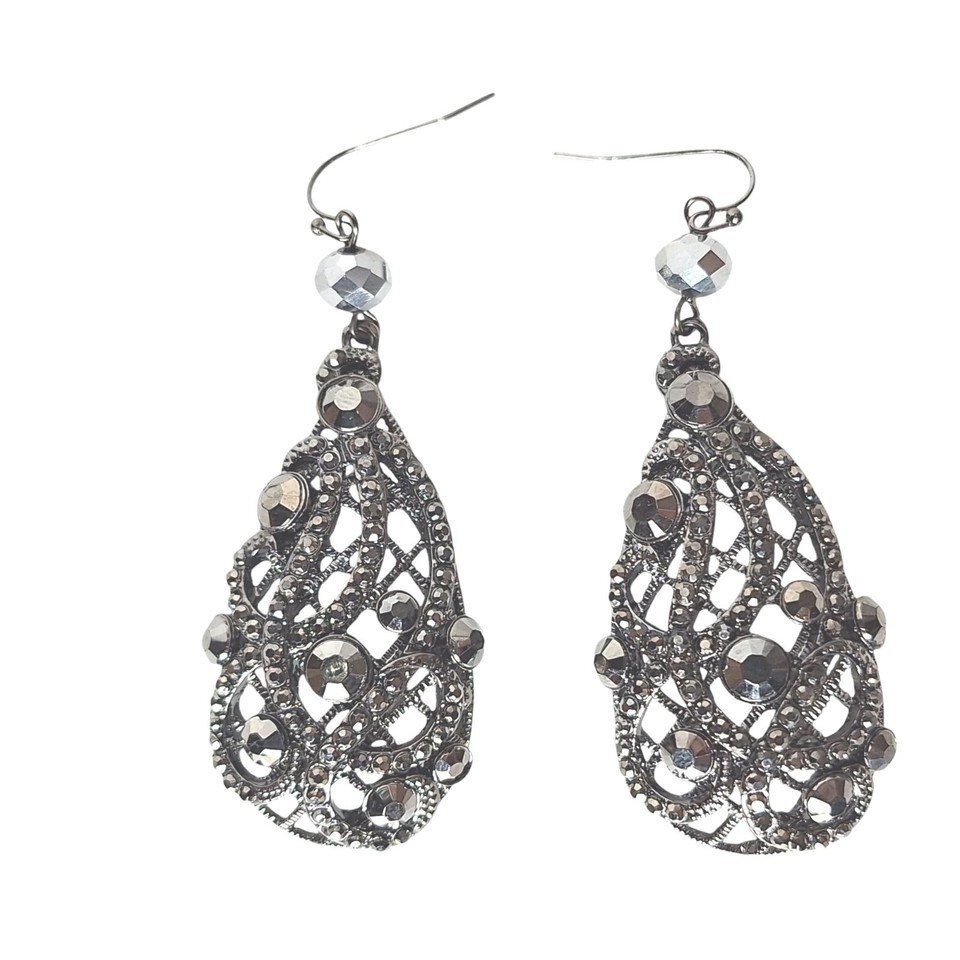 - Vintage Filigree Silver Tone Faceted Teardrop Open Faced Dangle Drop Earrings