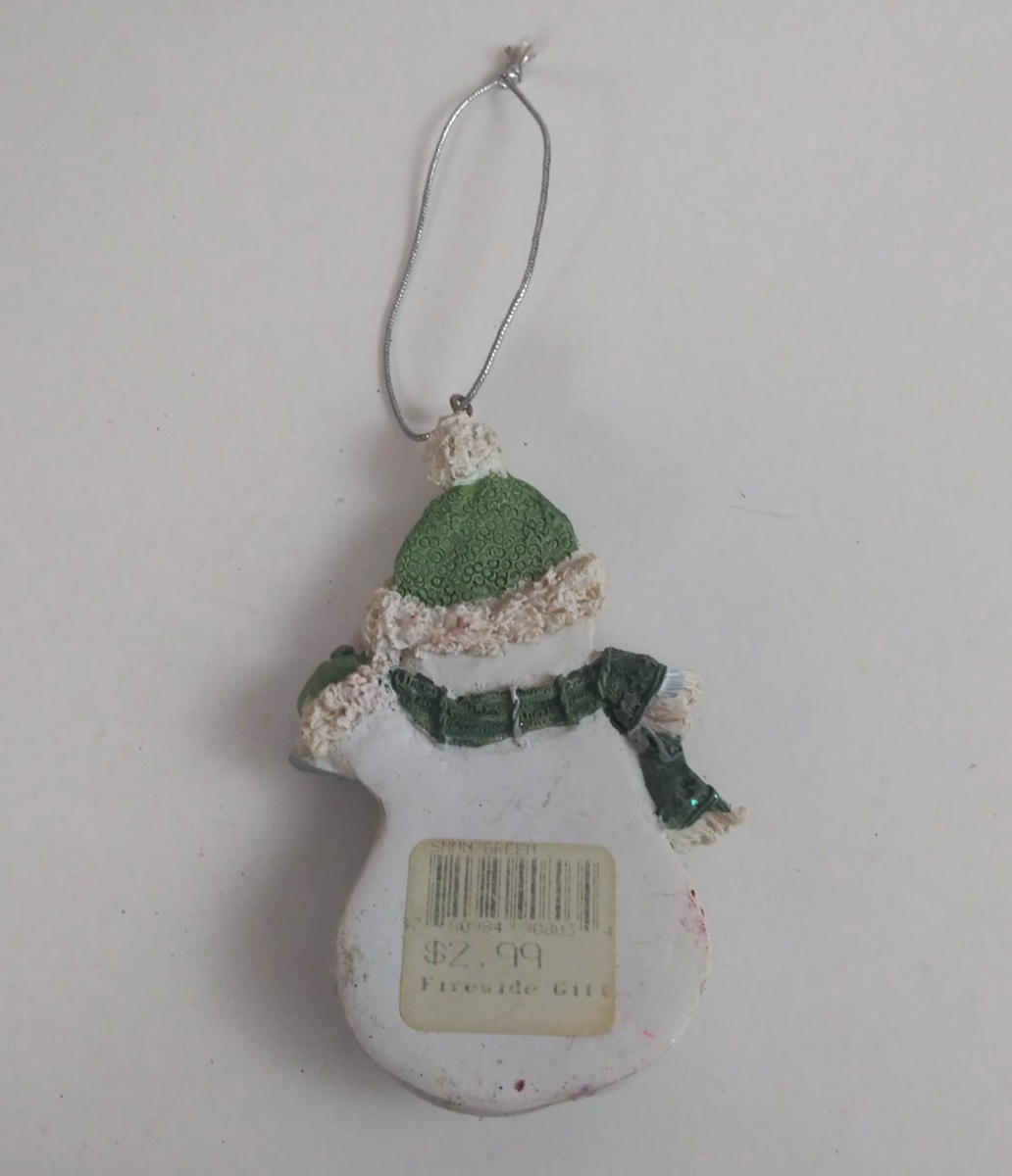 This is for a Vintage Fireside Gifts Snowman Wearing Green Hat Scarf 3.5" Christmas Ornament.