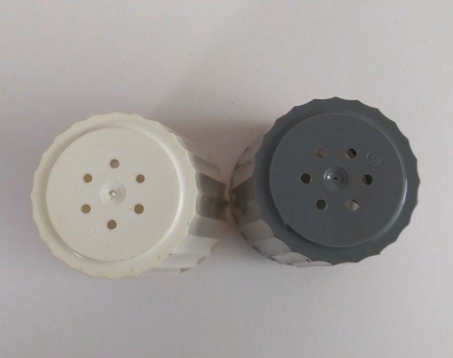 This is for a Vintage French's Gray White Restaurant Style Plastic Salt Pepper Shakers.