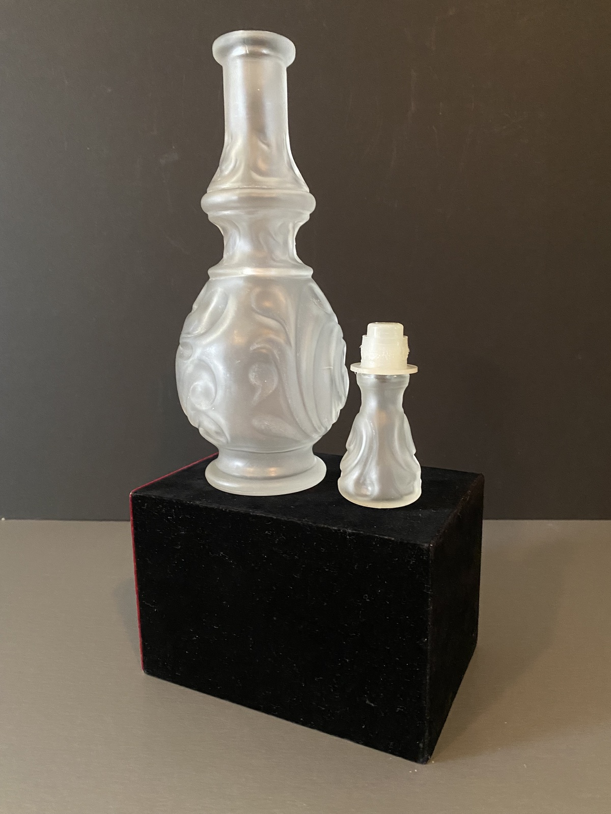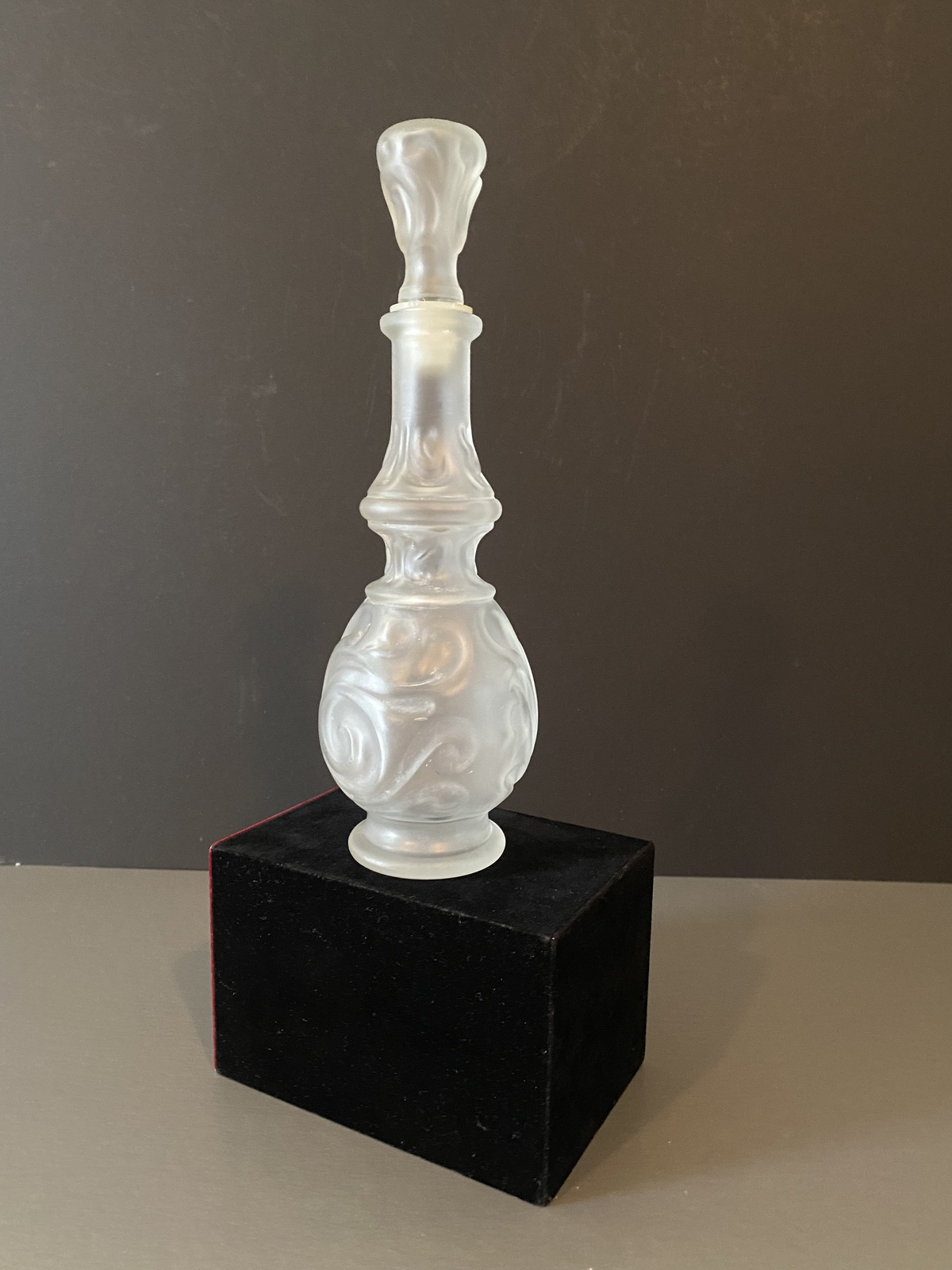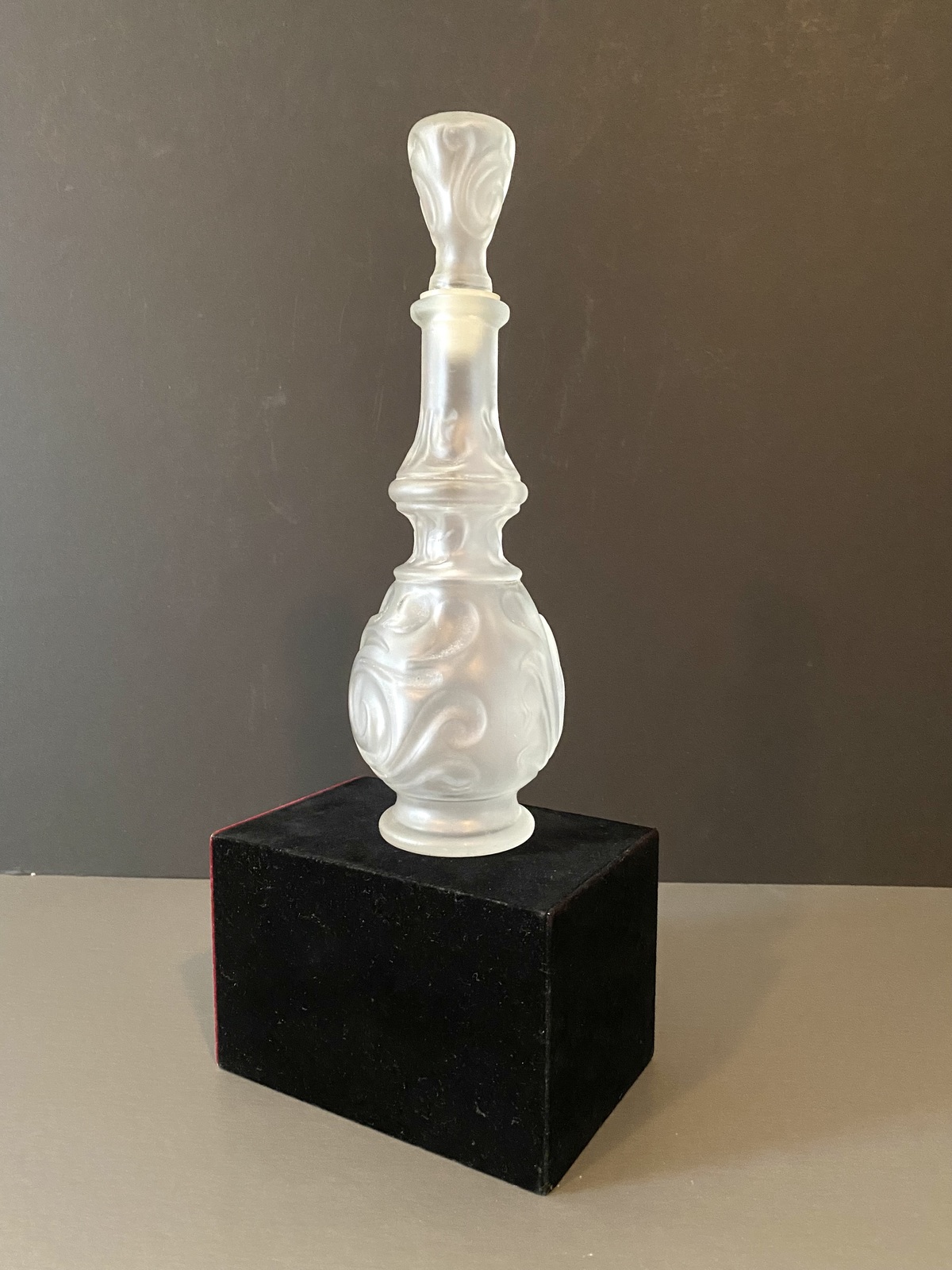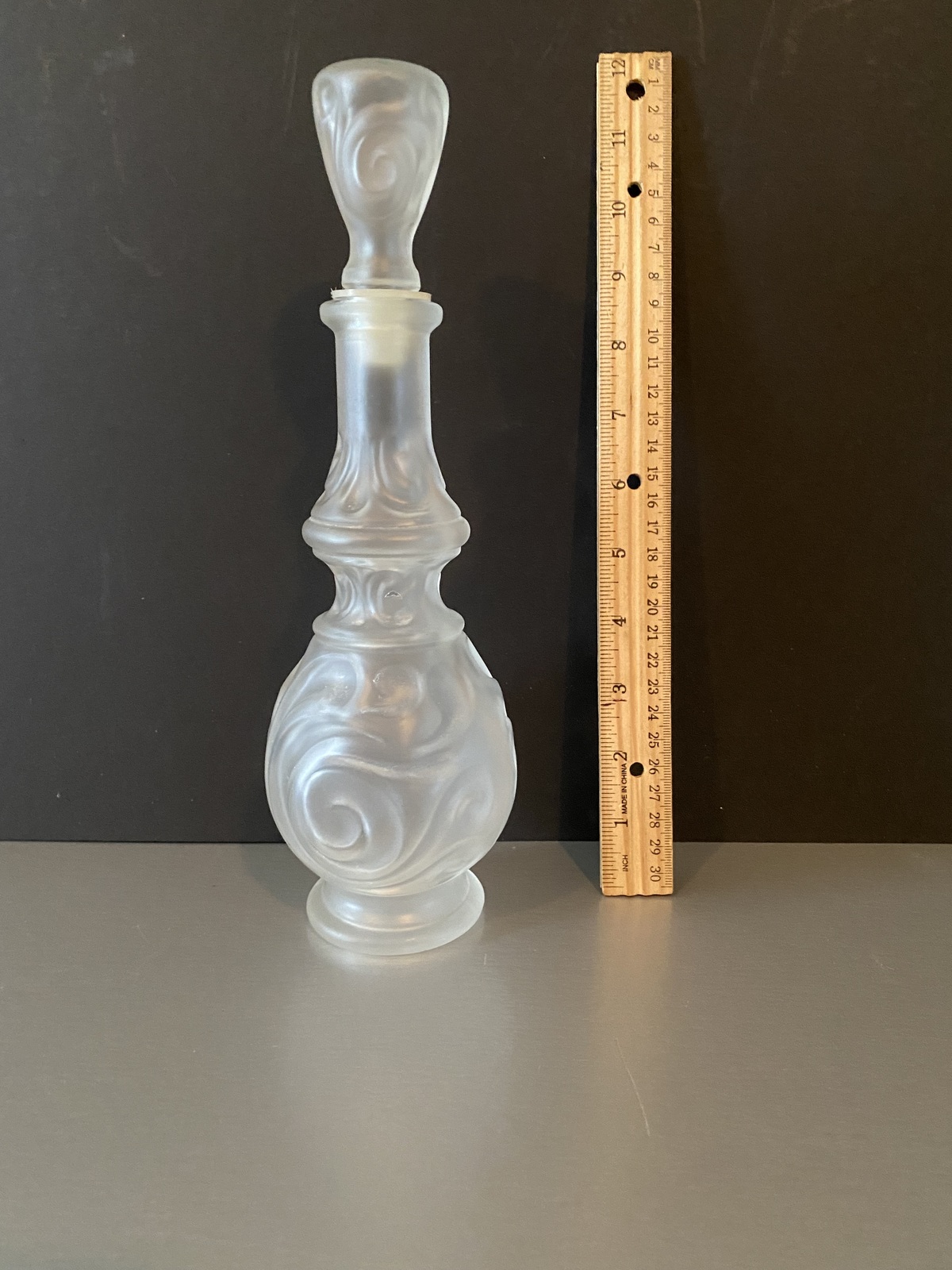 In this listing we are presenting a beautiful frosted glass wine decanter. Have you discovered the art of decanting wine yet? If you've tasted that slightly bitter, sometimes unpleasant taste you get when you open a bottle of red wine there's a way to eliminate the bitterness. By pouring your bottle into another container like this one and then leaving it open for an hour or two before serving it, that bitter taste or aftertaste will go away. Wine can become a more pleasant drink when it's decanted. It's amazing!