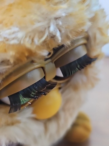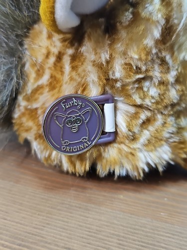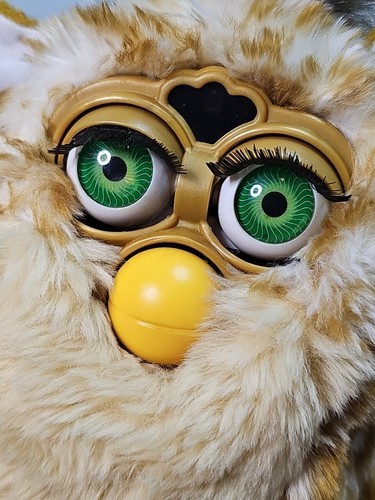 This Furby had a 2001 re-release, with an orange box, an updated story on the paper tag, a purple plastic tag, and some more eye colors outside of the usual brown, blue or green, including silver, neon green, and neon blue