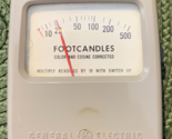 This is a Vintage GE Light Meter #213, designed for measuring foot-candles of light. It is an analog meter with dimensions of 3 inches in height, 2-1/2 inches in width, and 1-1/2 inches in depth.