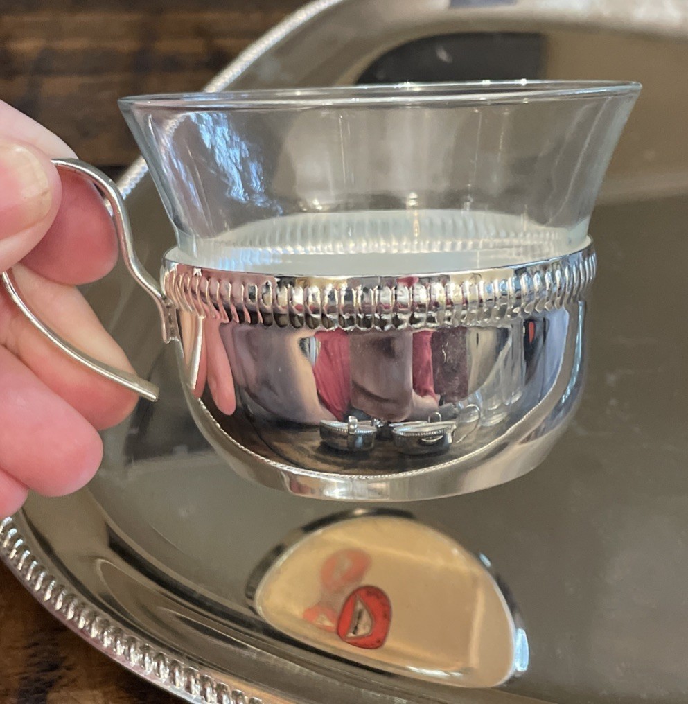 Pre-owned, very pretty set. No chips or cracks in the glasses. 4 of the 6 silver glass holders have a tiny crack inside where the handle is?but the structure of the silver cup holders are still solid and strong. See photos.