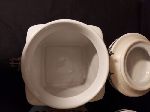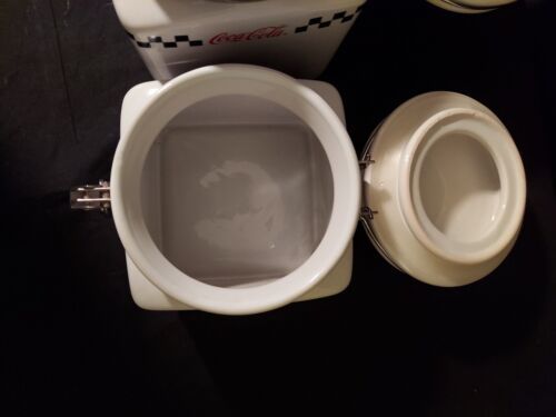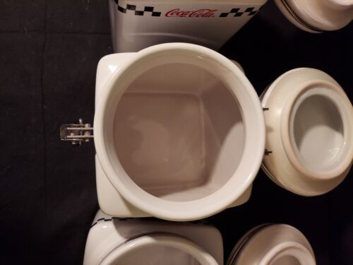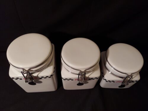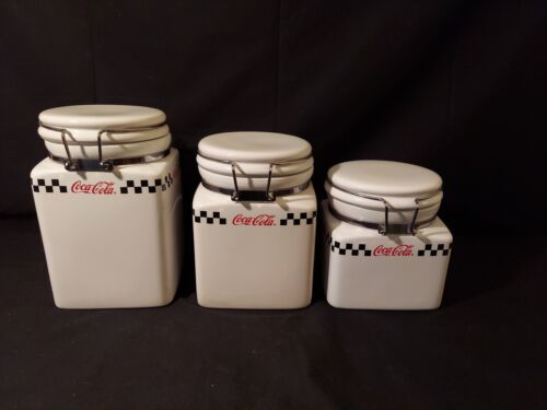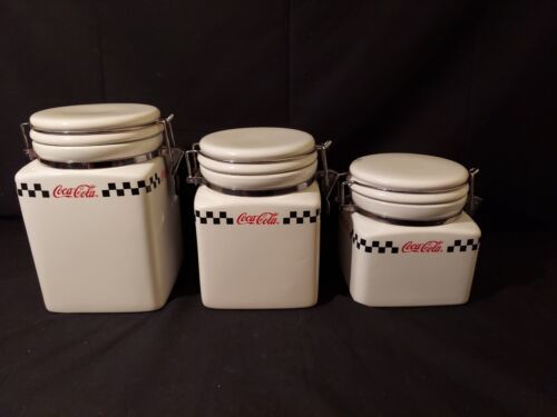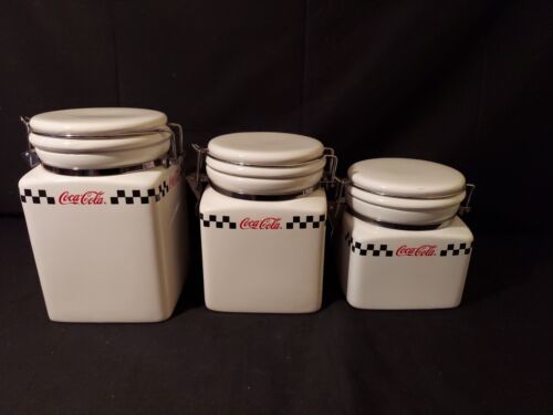 Vintage Gibson Coca Cola 3 Piece Canister Set 2002 Checkerboard Pattern. Set was on display only, never used. Very clean inside and out. Paint looks brand new, no chips/cracks/crazing. Lids clamp down firmly and seal tight. Amazing 3 piece cannister set.