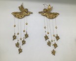 This charming pair of vintage gold-tone angel wall hangings features detailed trumpet-playing angels with cascading hanging stars and cherubs. Each piece measures approximately 15 inches long by 6 inches wide, making them a beautiful display for the holidays or year-round angel decor.