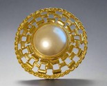 This elegant vintage brooch features a large faux pearl cabochon at the center, framed by an intricate open lattice gold-tone setting and finished with a textured rope edge. A timeless mid-century design that makes a versatile accessory for coats, blouses, scarves, or hats.