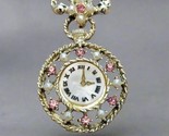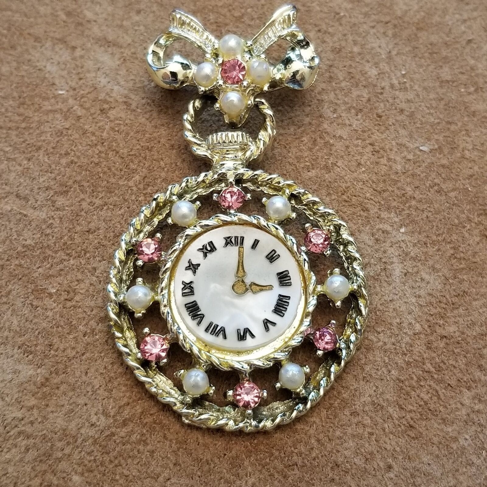 This charming vintage brooch is designed in the style of a pocket watch clock face, accented with delicate faux pearls and sparkling pink rhinestones. The round openwork frame is finished in gold tone and topped with a decorative bow, giving it a whimsical and romantic touch.