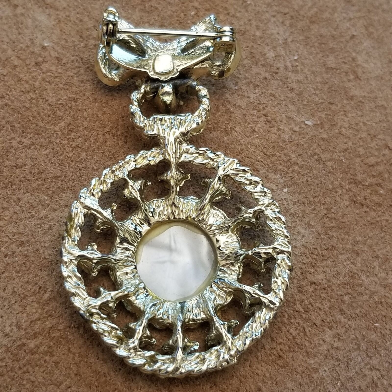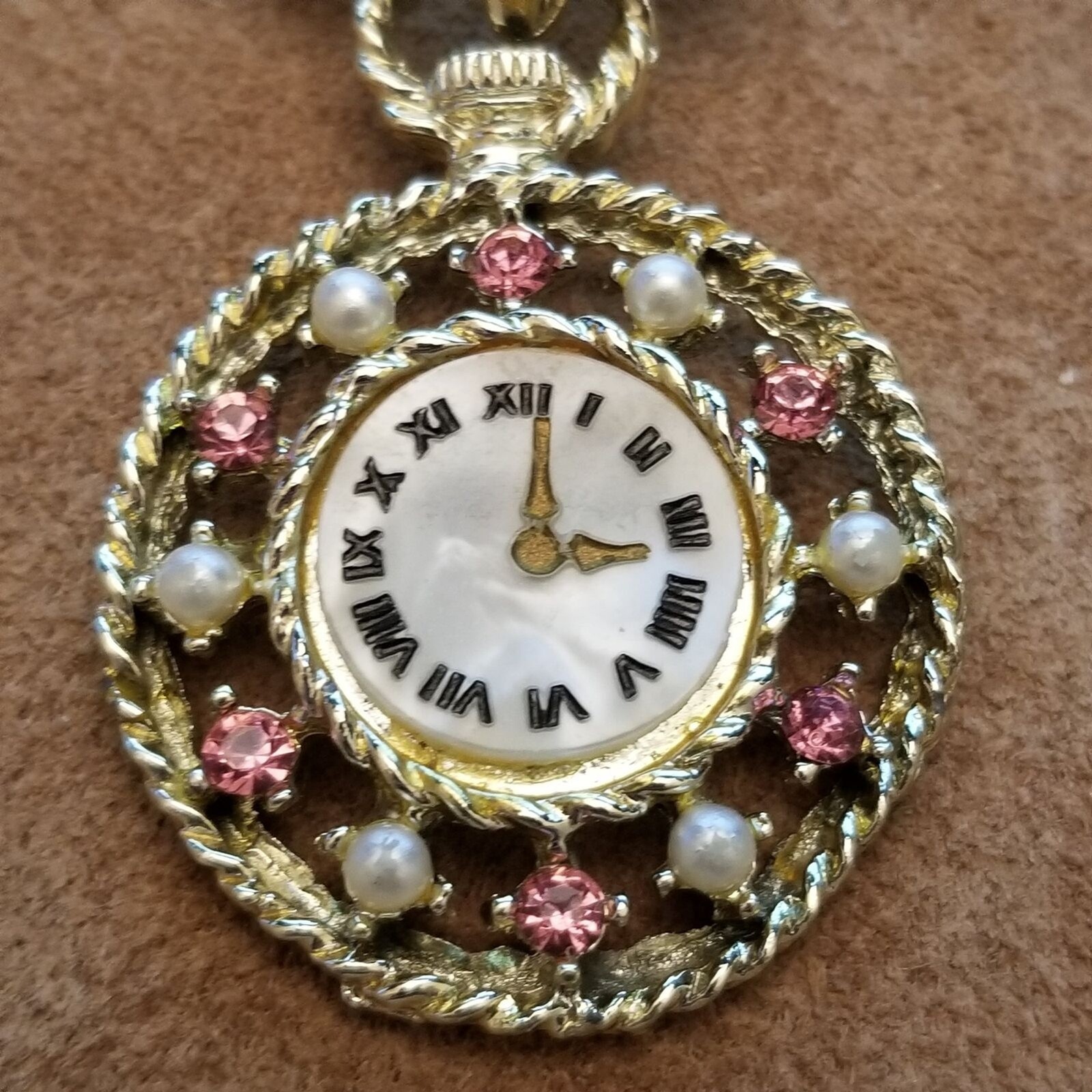 - Vintage Gold Tone Faux Clock Brooch with Pink Rhinestones & Faux Pearls