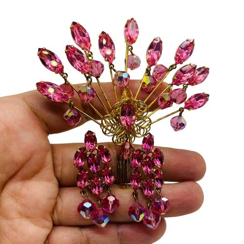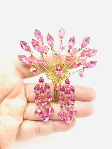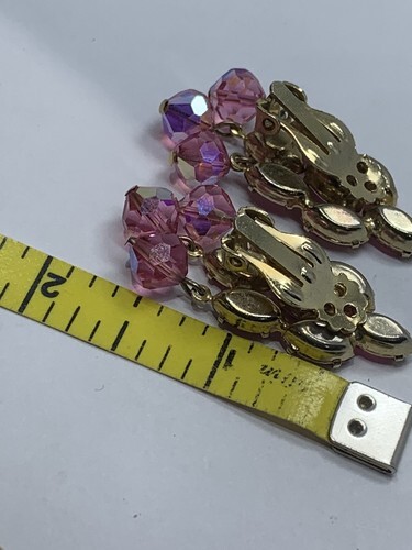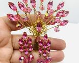 - Vintage Gold Tone Pink Rhinestone Crystal Charms Brooch Clip On Earrings