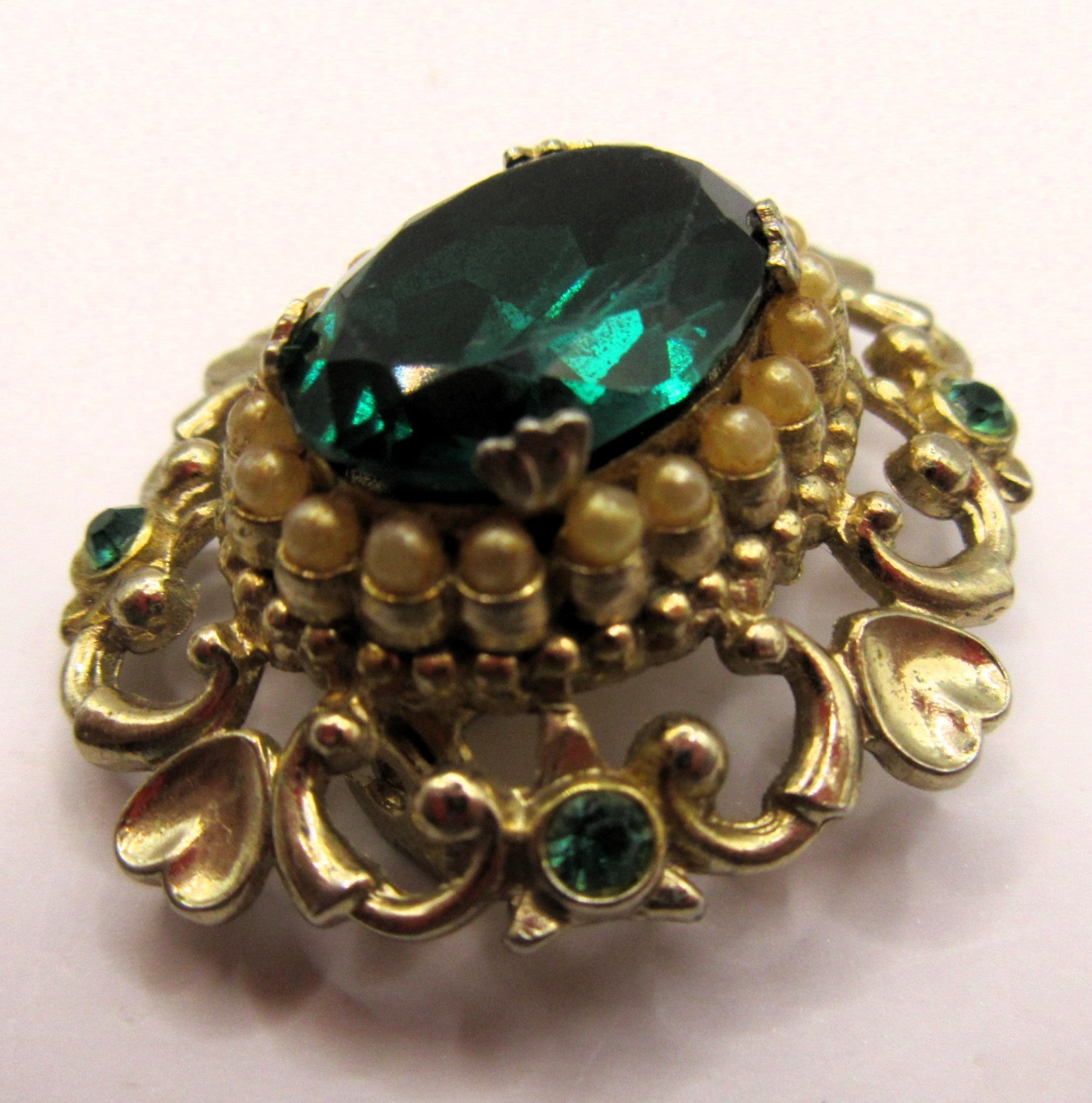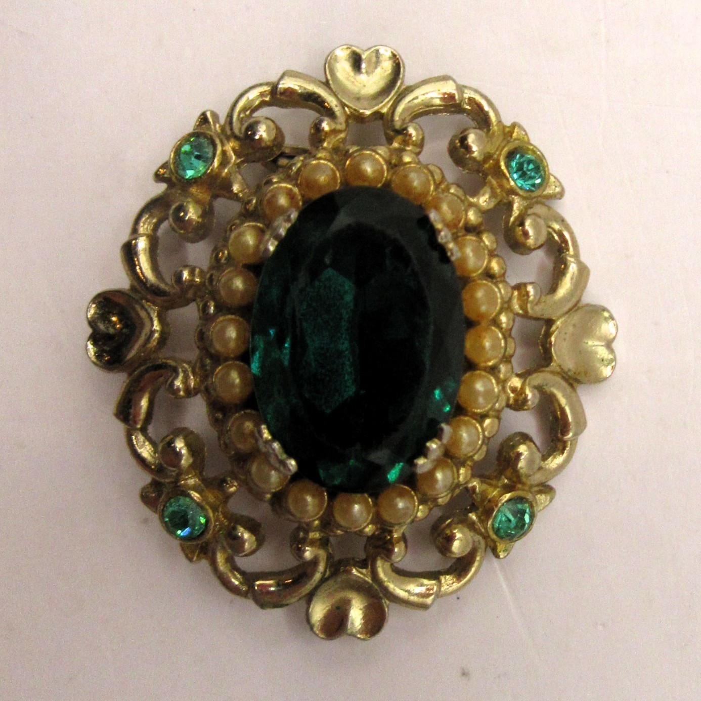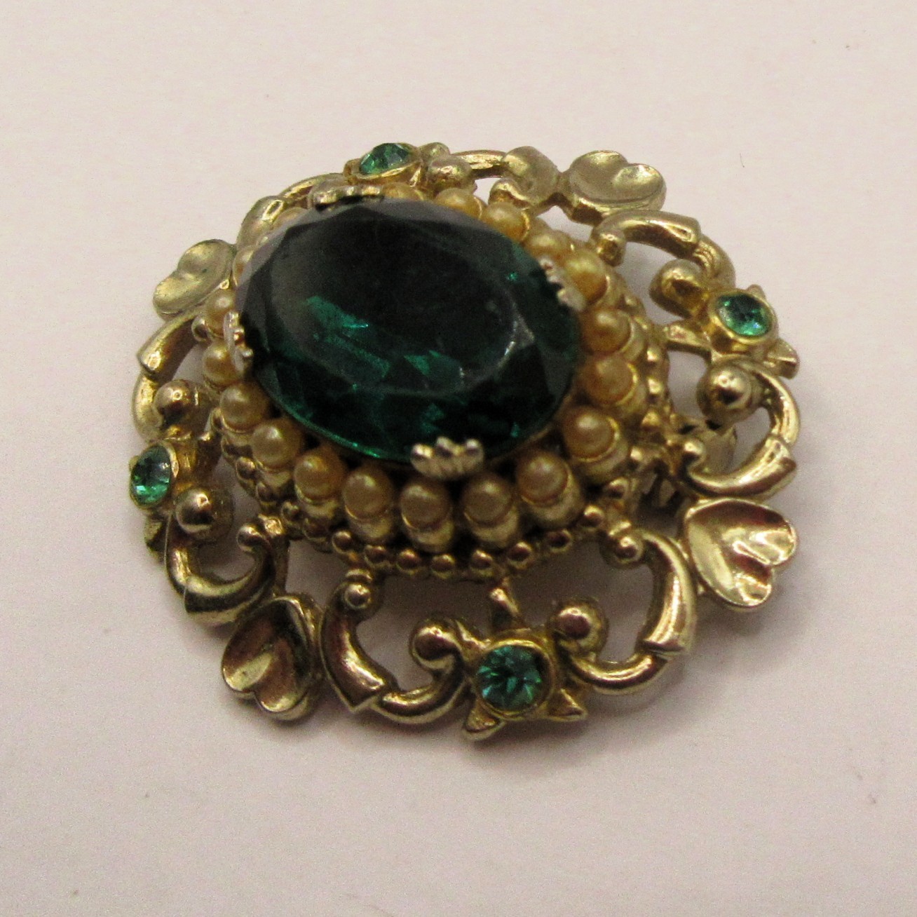 1.Gold-tone Coro Emerald Brooch with Seed Pearls.