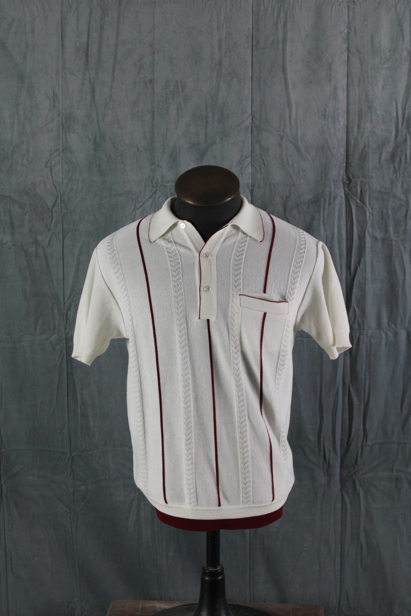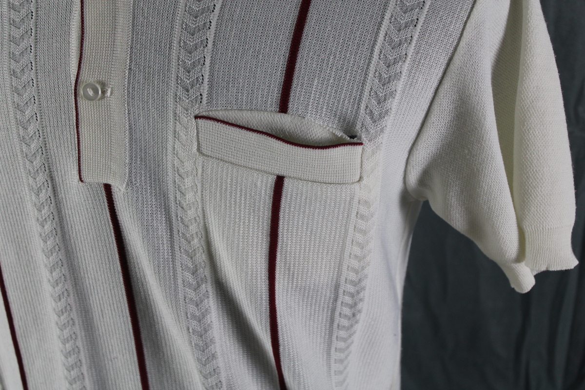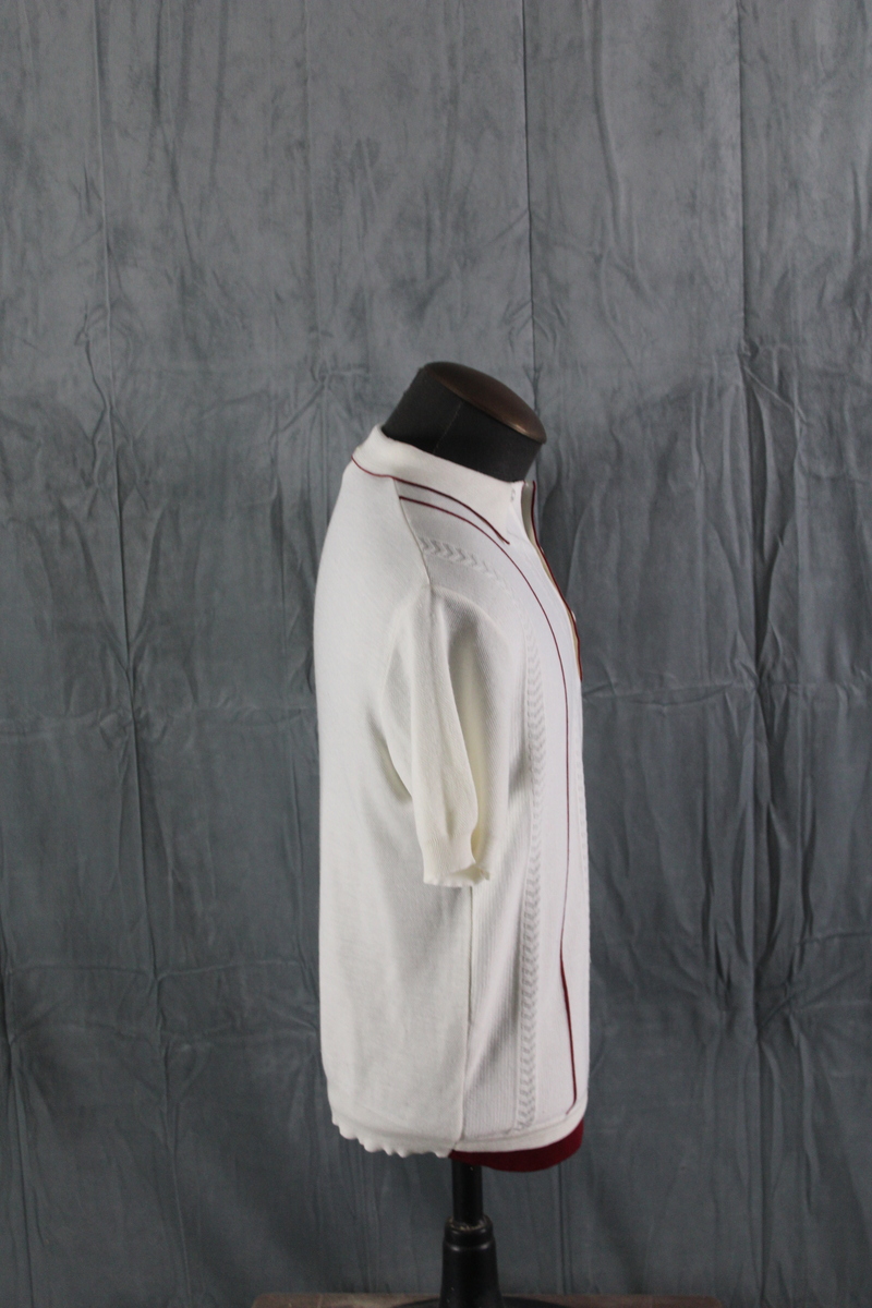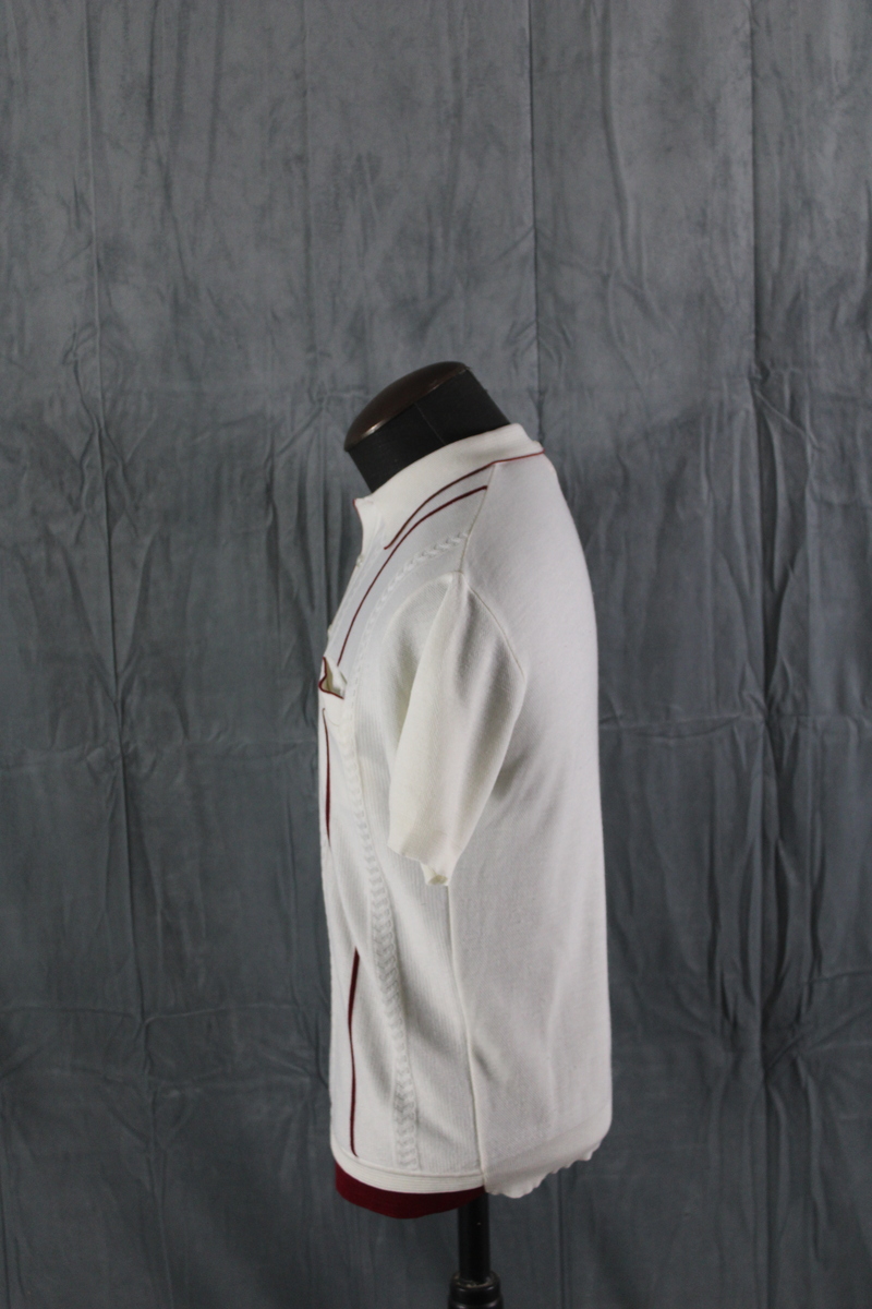 Up for sale is a vintage golf shirt. It has white textured body with red stripes on the sides of the front of the shirt. What a great vitnage shirt do not miss out on it.