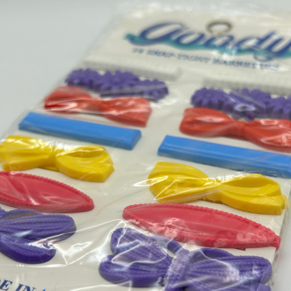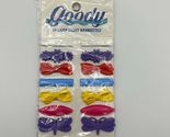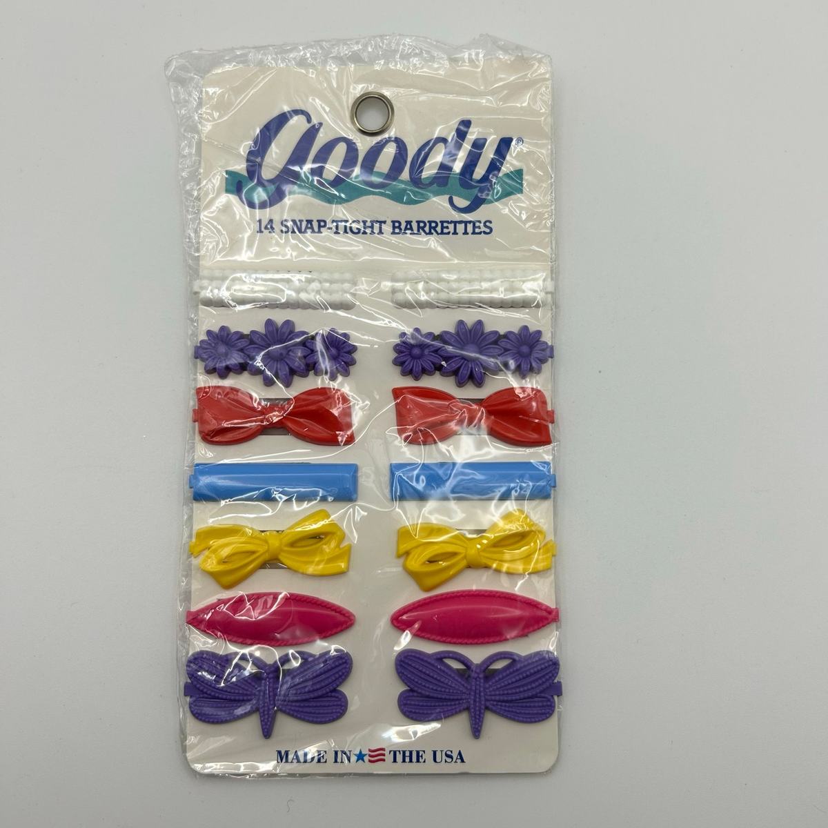 Authentic vintage Goody Snap-Tight Barrettes, still sealed in original packaging. Set of 14 colorful barrettes in classic 1980s styles ? bows, flowers, and sleek shapes in bright purple, red, yellow, and blue.